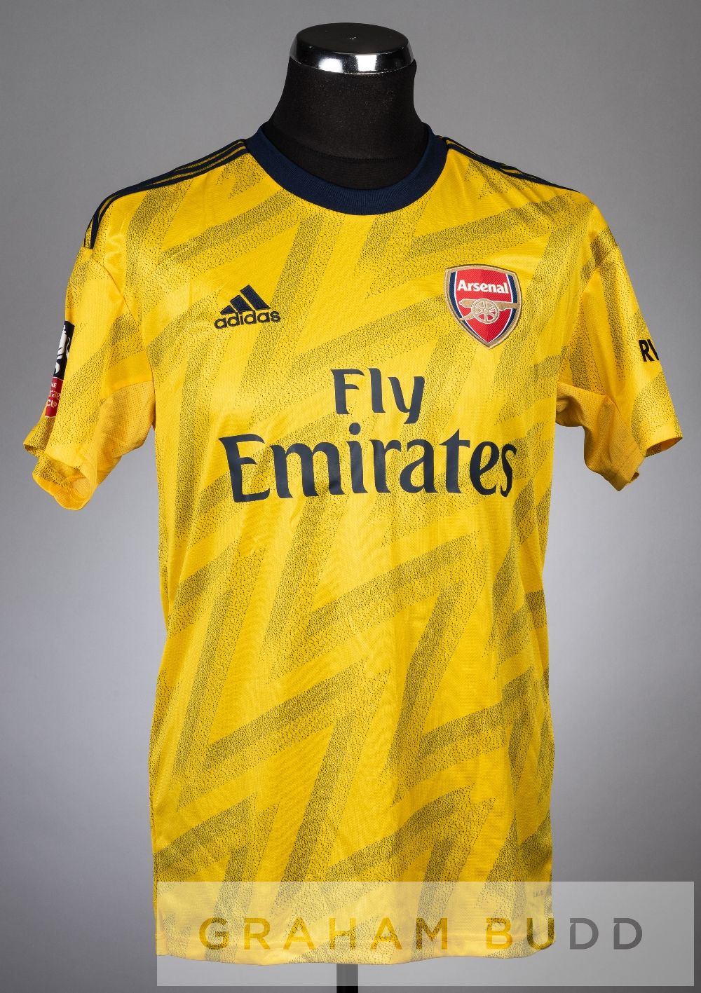 Hector Bellerin yellow and navy Arsenal no.2 away jersey season 2019-20, short-sleeved with THE EMIRATES FA CUP sleeve badge, club crest and sponsor logo, reverse lettered BELLERIN