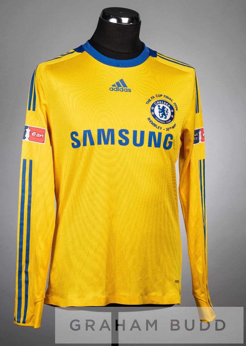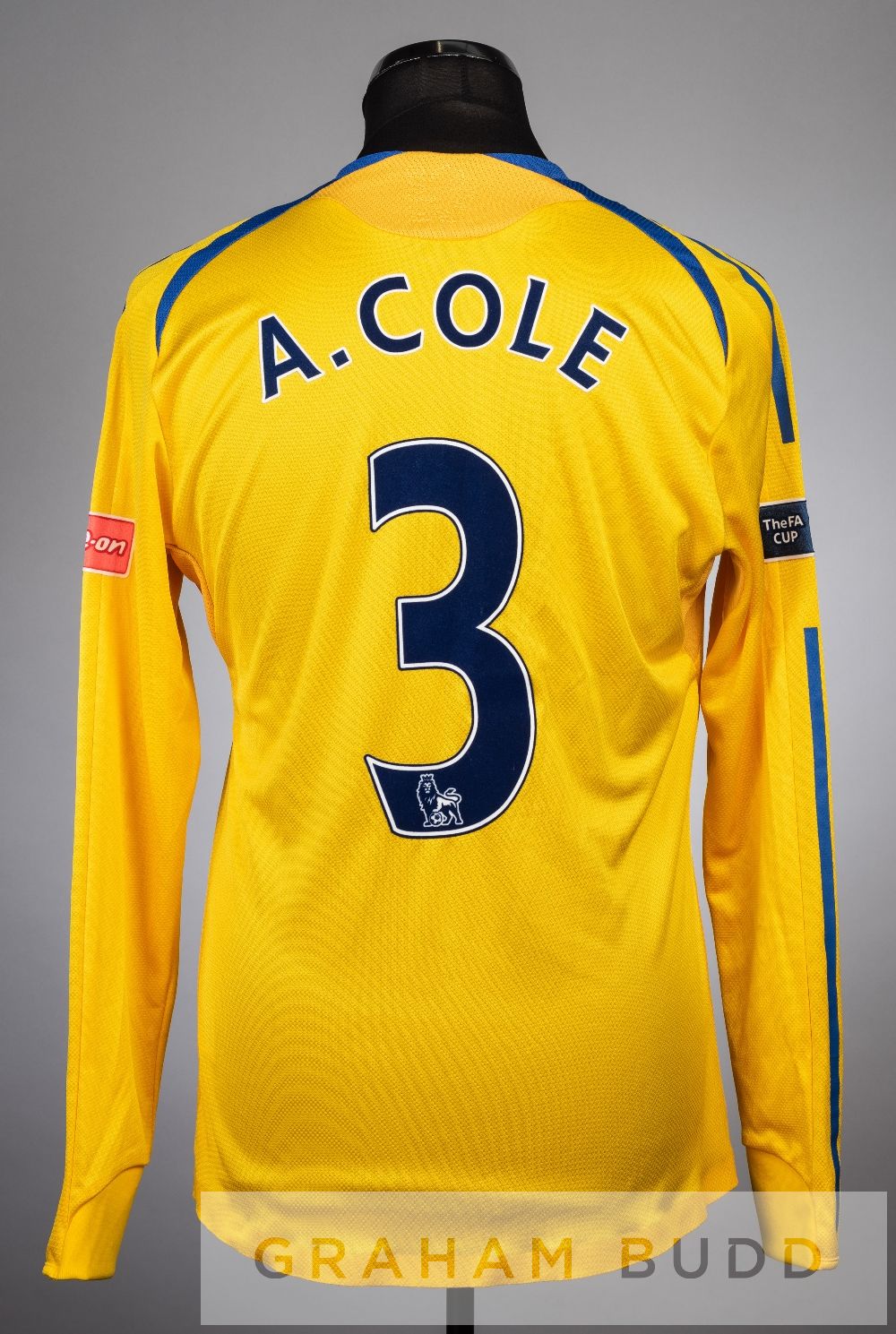Ashley Cole yellow and blue Chelsea no.3 third change jersey v Everton in the FA Cup Final at Wembley, 30th May 2009, spare long-sleeved with THE FA CUP sleeve badges, club crest and sponsor logo, embroidered THE FA CUP FINAL 2009 WEMBLEY - 30TH MAY, reverse lettered A. COLE Chelsea defeated Everton 2-1.