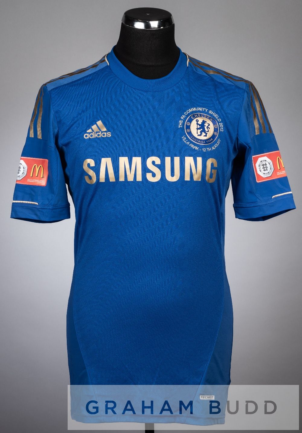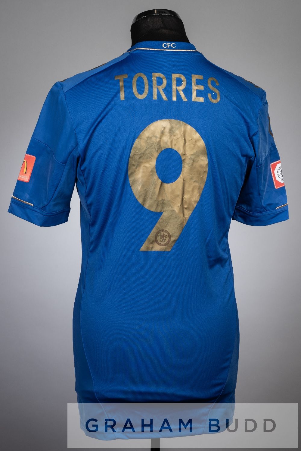 Fernando Torres blue Chelsea no.9 home jersey v Manchester City in the FA Community Shield at Villa Park, 12th August 2012, short-sleeved with THE FA COMMUNITY SHIELD sleeve badges, embroidered THE FA COMMUNITY SHIELD 2012 VILLA PARK - 12TH AUGUST club crest and sponsor logo, reverse lettered TORRES, wear to lettering and number on reverse Manchester City defeated Chelsea 3-2, with Fernando Torres the first of Chelsea's two goals, the other by Ryan Bertrand.