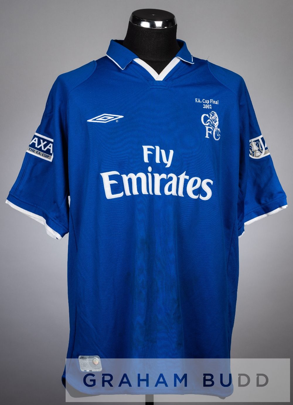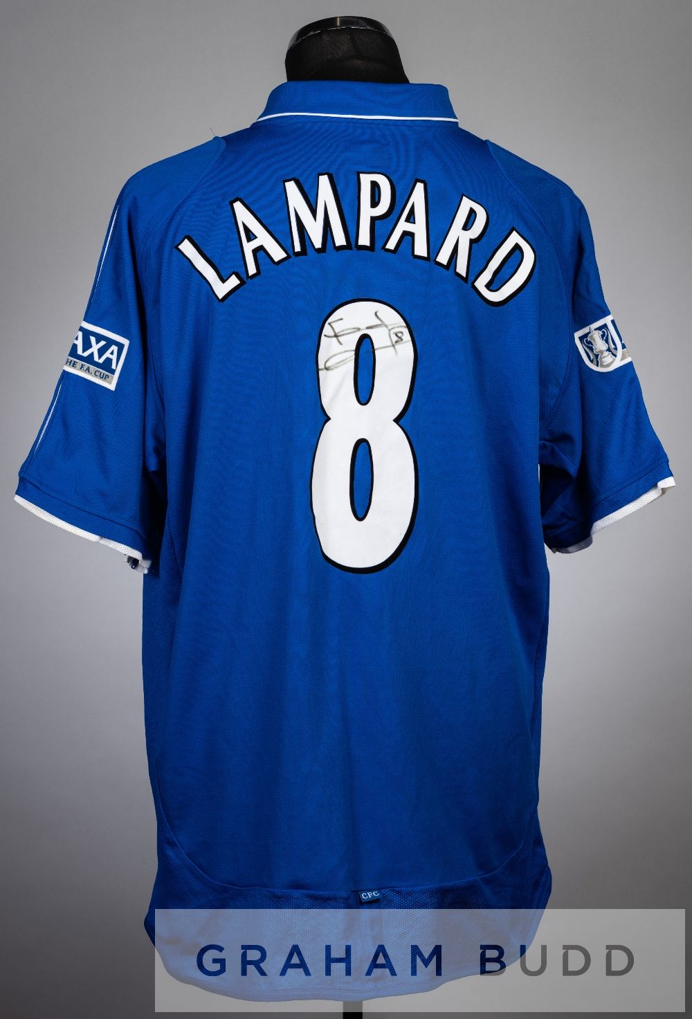 Frank Lampard signed blue Chelsea no.8 jersey v Arsenal in the FA Cup Final at Millennium Stadium, 4th May 2002, short-sleeved with THE F.A. CUP sleeve badges, embroidered F.A. CUP FINAL 2002, club crest and sponsor logo, reverse lettered LAMPARD, signed in black marker pen in the number 8 Arsenal defeated Chelsea 2-0.