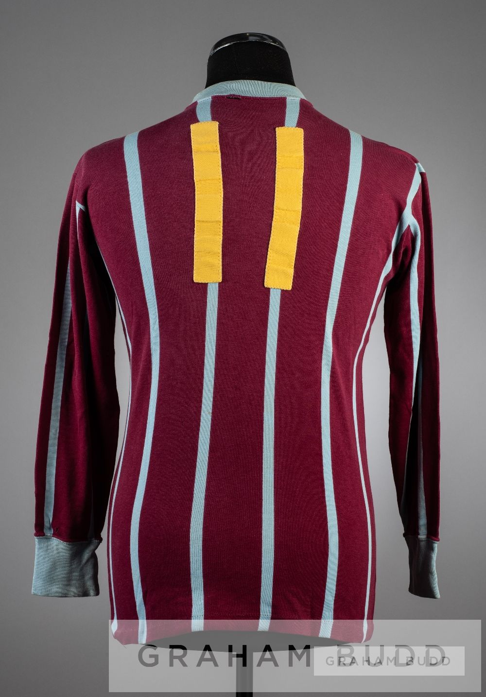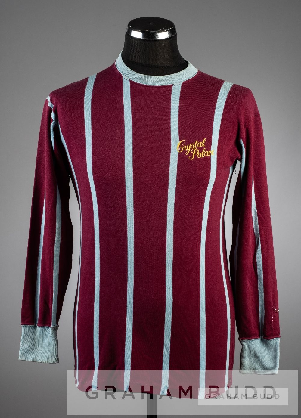 Claret and blue striped Crystal Palace No.11 home jersey, circa 1968, long-sleeved, inscribed in gold CRYSTAL PALACE, number in gold on reverse, small tear below collar seam at reverse In the pre-squad numbering era it is not possible to identify the relevant player definitively. If it was possible to date the jersey specifically to the 1968-69 season then the overwhelming candidate would be Colin Taylor. B worn the No.11 jersey throughout the season. But if the jersey relates to the previous season 1967-68, there is no obvious player to associate.