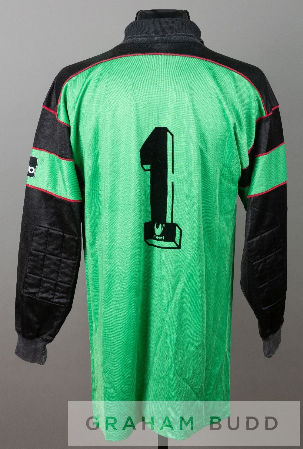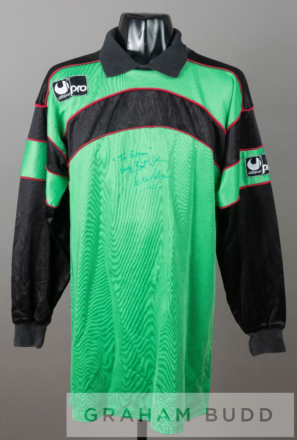 Peter Shilton signed green Derby County no.1 goalkeeper's jersey, circa 1990, by Uhlsport, long-sleeved with padded elbows, club crest and sponsor logo, reverse numbered 1, signed in blue marker pen with dedication to Bryan Horsnell "to Bryan very best wishes Peter Shilton" Derby County's jersey sponsor at this time was Umbro. However Peter Shilton had a special arrangement and could wear goal keeping jersey's made by Uhlsport.