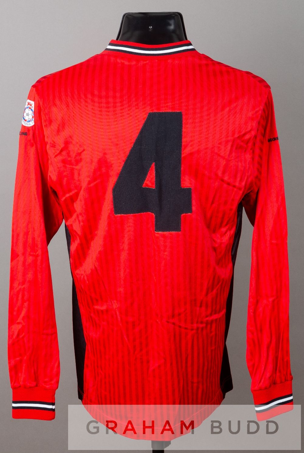 Ray Lewington red Fulham no.4 away jersey, season 1987-88, by Scoreline, long-sleeved with Scoreline sleeve logo's and bearing one THE FOOTBALL LEAGUE sleeve badge on left sleeve, embroidered crest, reverse numbered 4 Curiously this 1987-88 jersey appears to have a later Football League sleeve badge sewn high onto the left sleeve. Definitely a later edition for reasons unclear. Ray Lewington was the player manager for Fulham in this season.