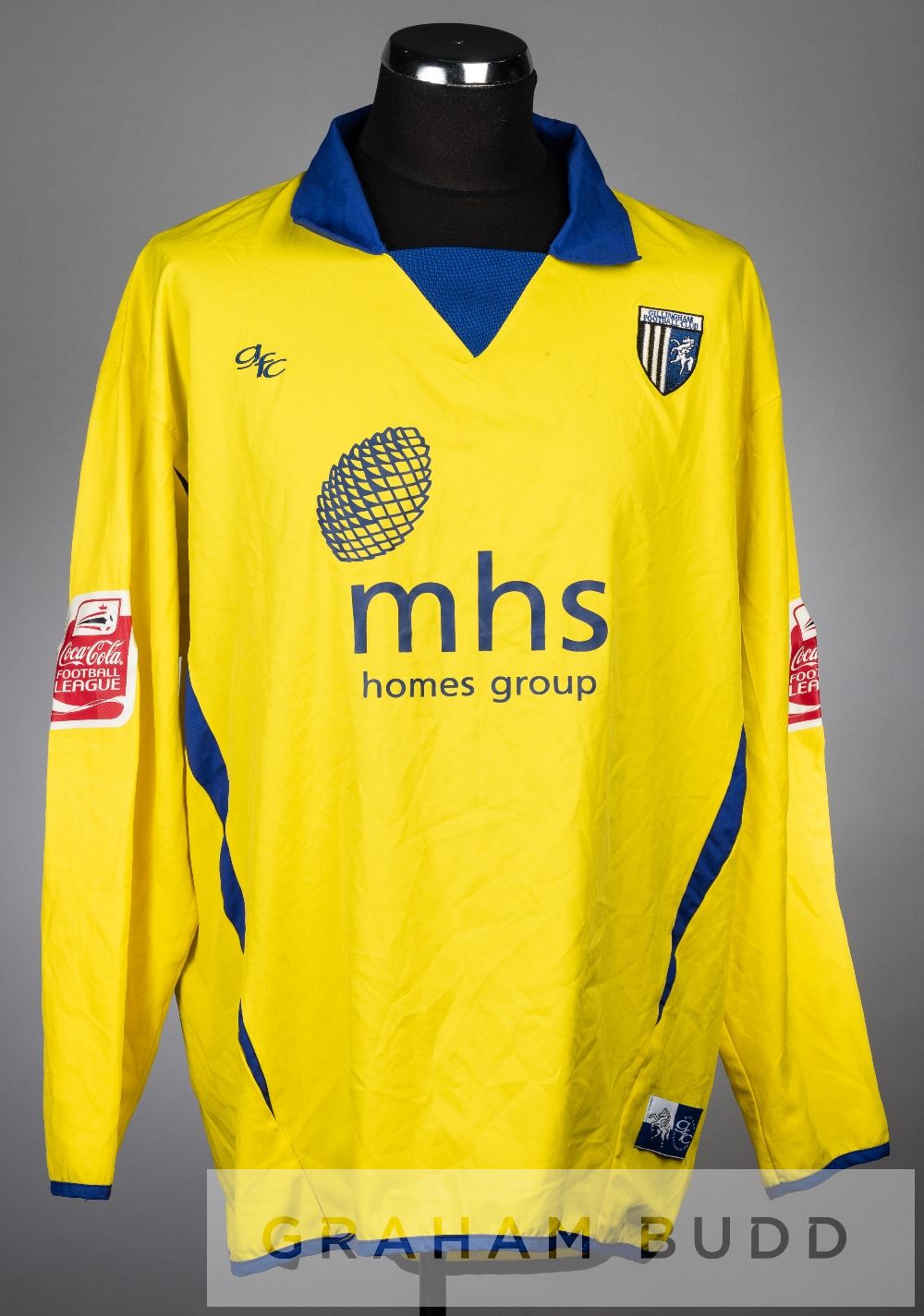 Darius Henderson signed yellow and blue Gillingham no.9 away jersey, season 2004-05, long-sleeved with Coca Cola Football League sleeve badges, club