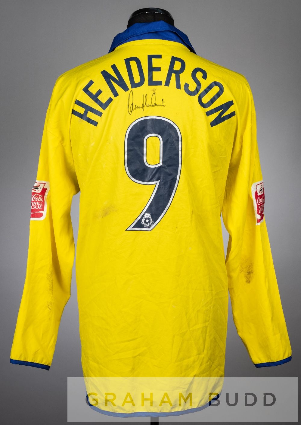 Darius Henderson signed yellow and blue Gillingham no.9 away jersey, season 2004-05, long-sleeved with Coca Cola Football League sleeve badges, club crest and sponsor logo, reverse lettered HENDERSON, signed in black marker pen to reverse, bears signs of pitch dirt Provenance: Linvoy Primus Portsmouth swap jersey's.