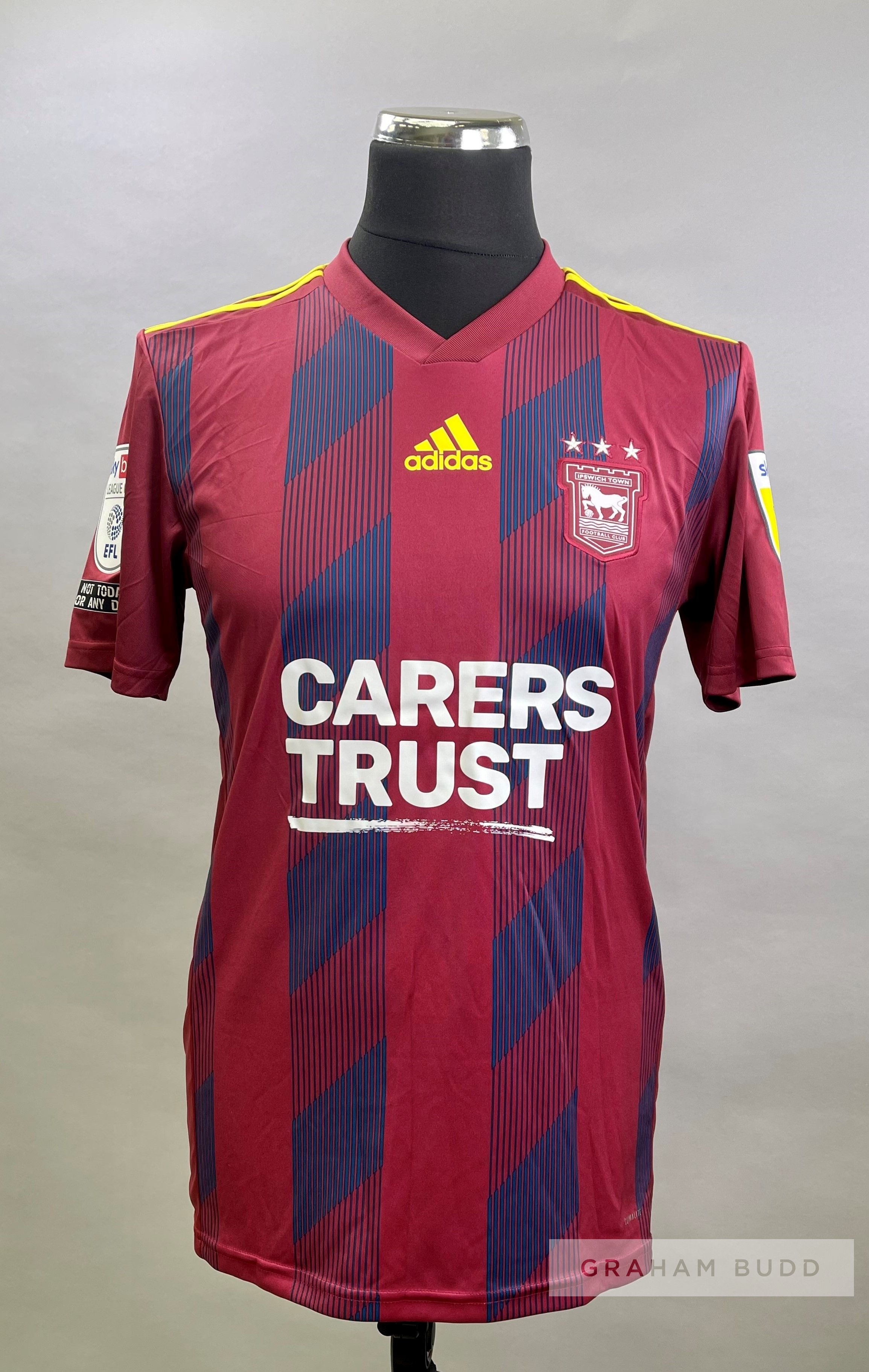 Alan Judge claret, navy and yellow Ipswich Town no.18 third choice jersey, season 2020-21, short-sleeved with SKY BET LEAGUE ONE EFL and SKY BET STAY IN CONTROL SET A DEPOSIT LIMIT, club crest and sponsor logo, reverse lettered JUDGE