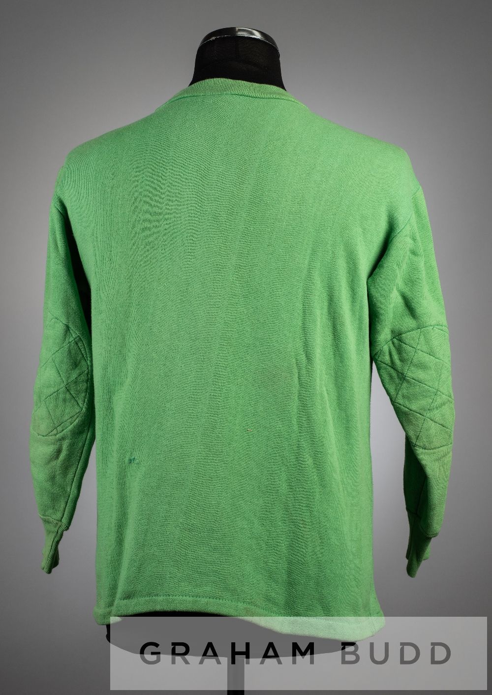 1960s green Leeds United goalkeepers jersey, long-sleeved shirt with embroidered white owl crest, padded chest and elbows, bears UMBRO label bears some wear, fading and old repair to reverse of jersey, minor hole at neck collar shoulder seam, minor stain to front