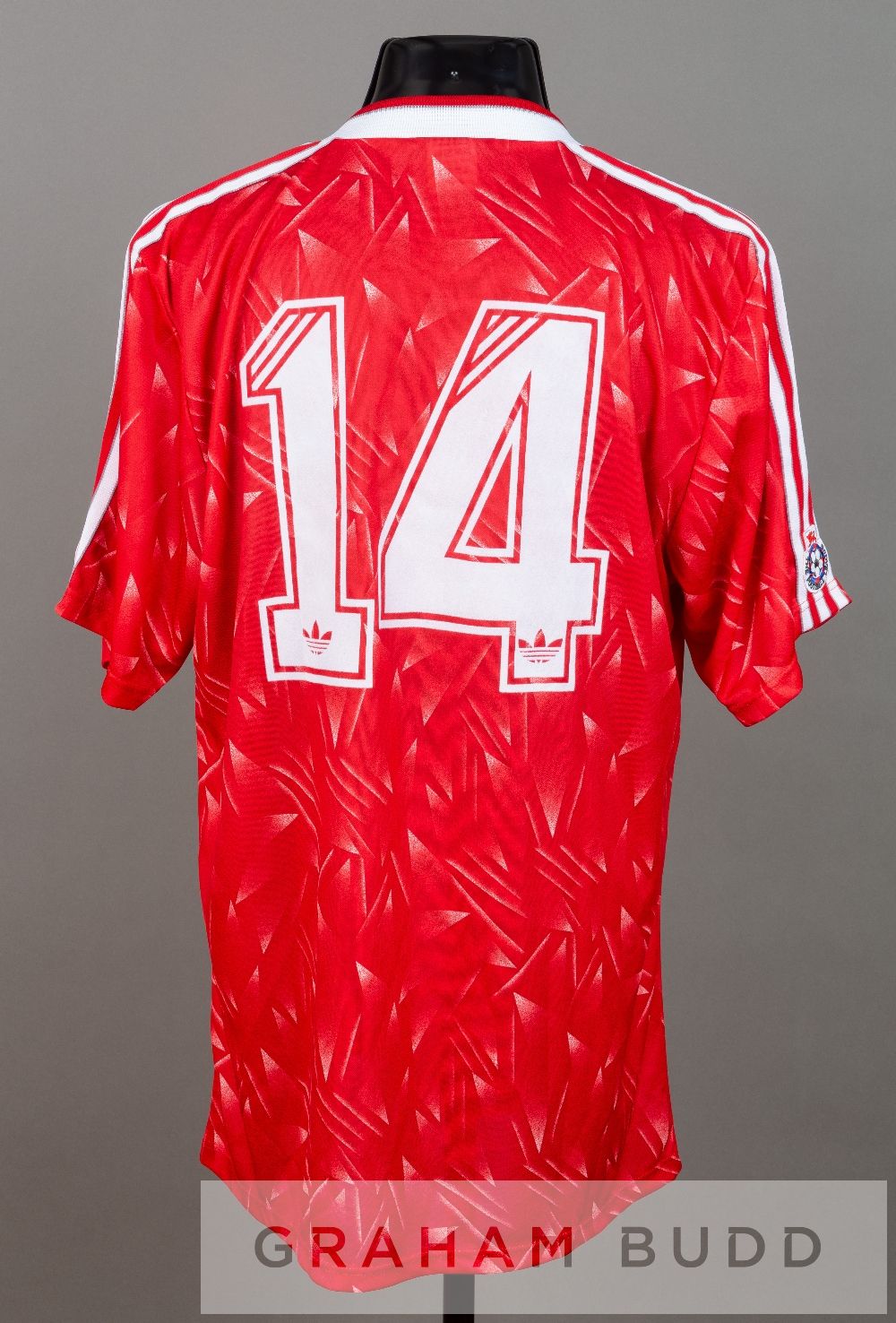 Red and white Liverpool no.14 home substitute's jersey, season 1990-91, short-sleeved with THE FOOTBALL LEAGUE sleeve badges, club crest and sponsor logo, reverse numbered 14 In season 1990-91 the no.14 substitute's jersey was worn on field by Burrows, Malby, Houghton, Staunton and Carter.