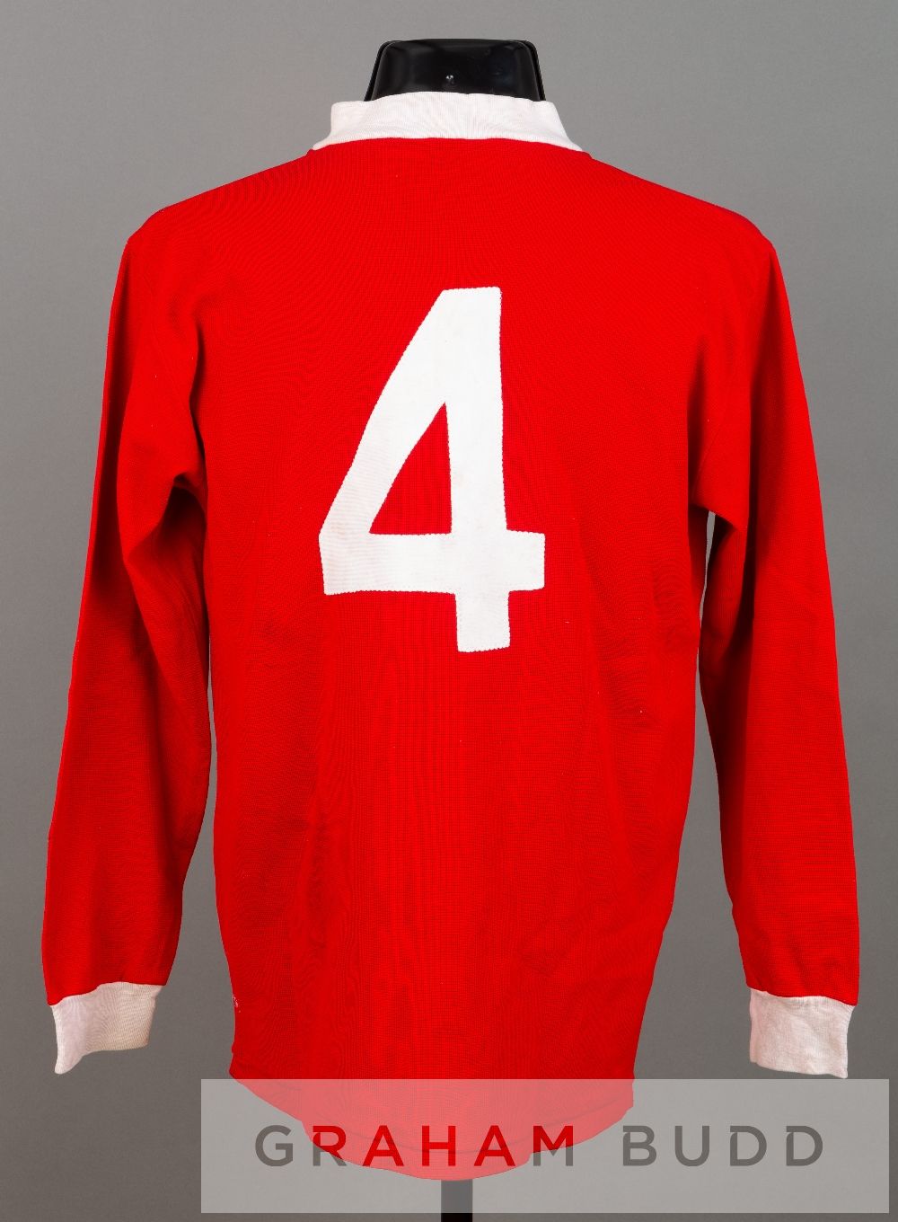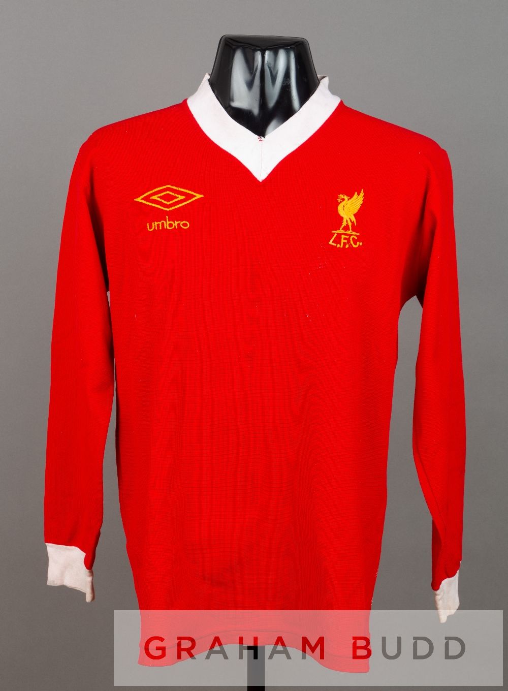 Tommy Smith red Liverpool no.4 home jersey, season 1976-77, by Umbro, long-sleeved with embroidered club crest and UMBRO logo, reverse numbered 4, bears minor marks to reverse Liverpool won the Football League in this season 1976-77. Provenance: given to a member of the famous Anfield boot room.