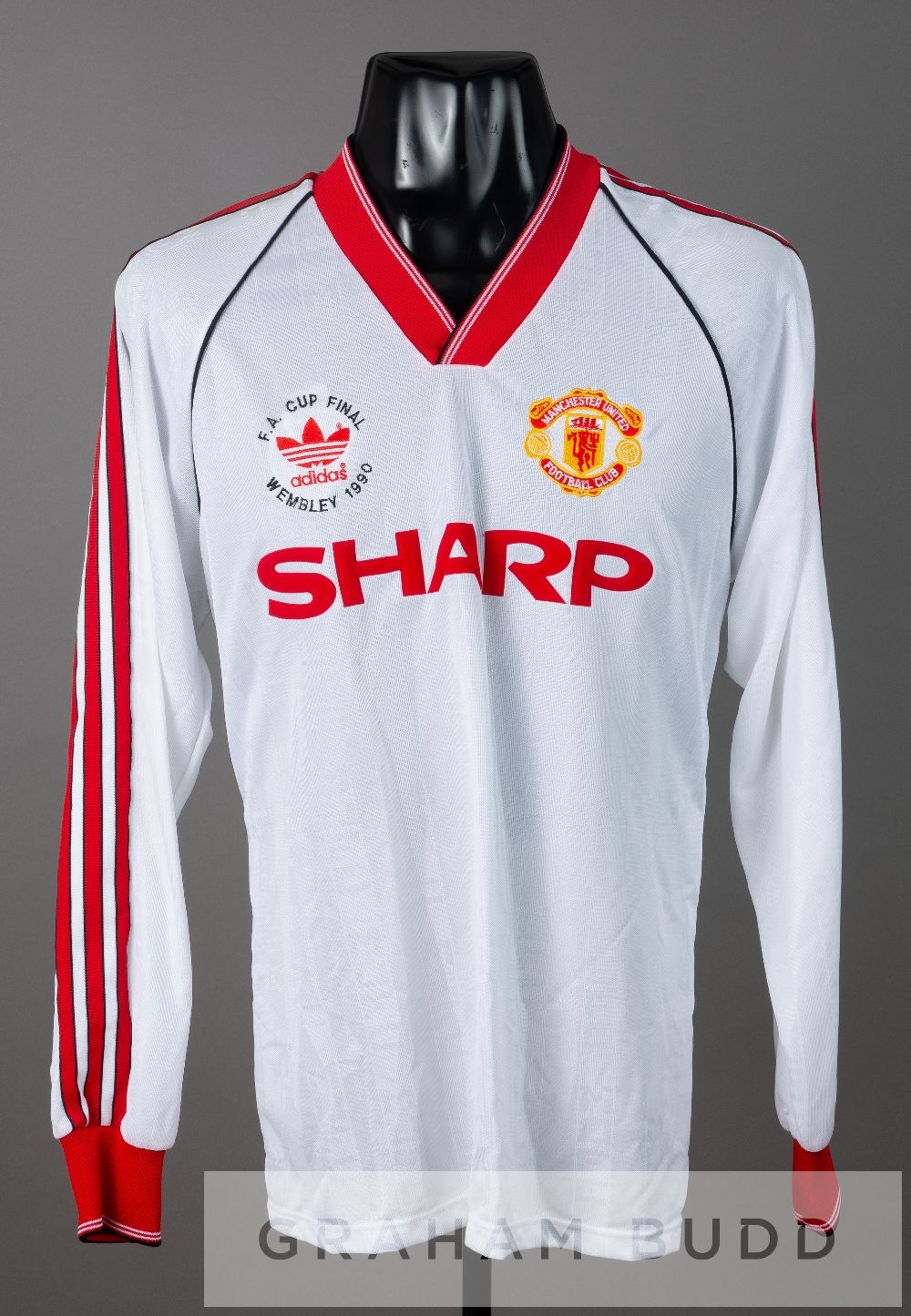 White Manchester United no.15 substitute's jersey from the 1990 F.A. Cup Final, by Adidas, long-sleeved unused substitute's issue, embroidered club crest and sponsor logo, inscribed F.A. CUP FINAL WEMBLEY 1990, reverse numbered 15 Manchester United worn their white strip in the FA Cup Final and their red strip in the replay.