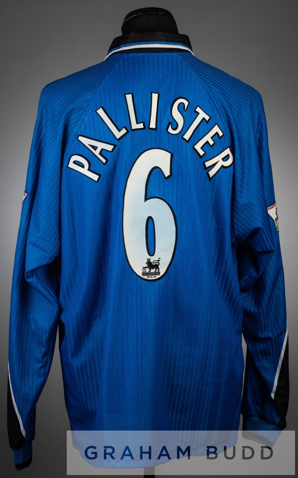 Gary Pallister blue and white Manchester United no.6 third choice jersey, season 1997-98, long-sleeved with THE FA PREMIER LEAGUE CHAMPIONS 1996-1997 sleeve badges, club crest and sponsor logo, reverse lettered PALLISTER