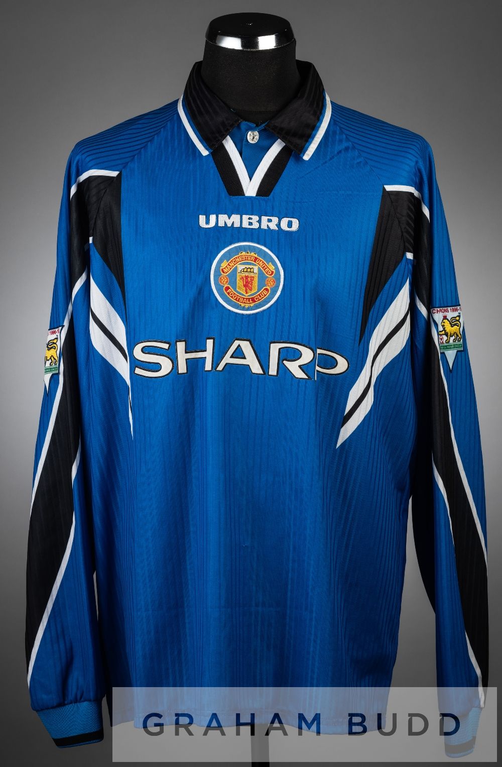 Gary Pallister blue and white Manchester United no.6 third choice jersey, season 1997-98, long-sleeved with THE FA PREMIER LEAGUE CHAMPIONS 1996-1997