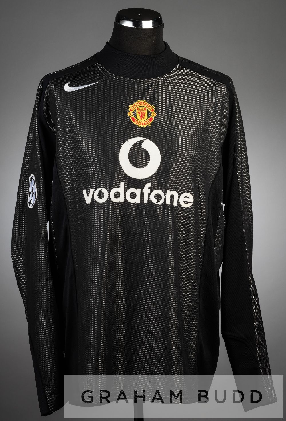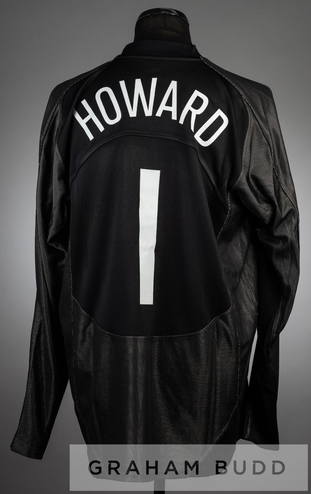 Tim Howard black Manchester United no.1 goalkeeper's away jersey v AC Milan in the UEFA Champions League Round of 16 second leg at San Siro, 8th March 2005, long-sleeved with UEFA STARBALL sleeve badge, club crest and sponsor logo, reverse lettered HOWARD Ac Milan defeated Manchester United 1-0, with AC Milan winning 2-0 on aggregate.