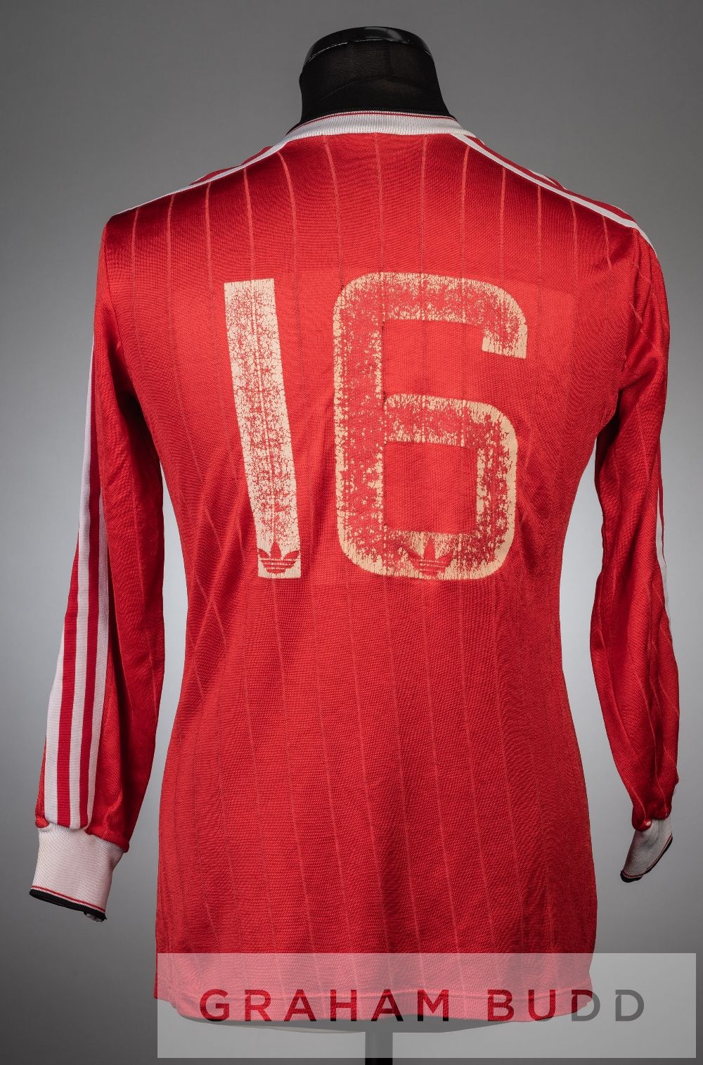 Red and white Manchester United no.16 substitute's home jersey, season 1983-84, long-sleeved, embroidered with F.A. CUP WINNERS 1983, club crest and sponsor logo, reverse numbered 16, bears wear to reverse number and jersey