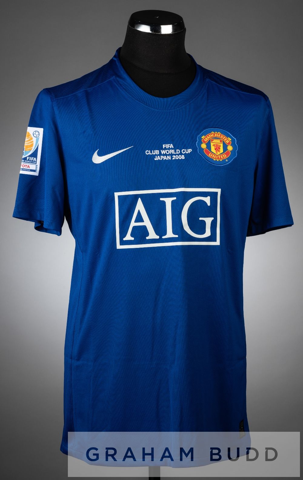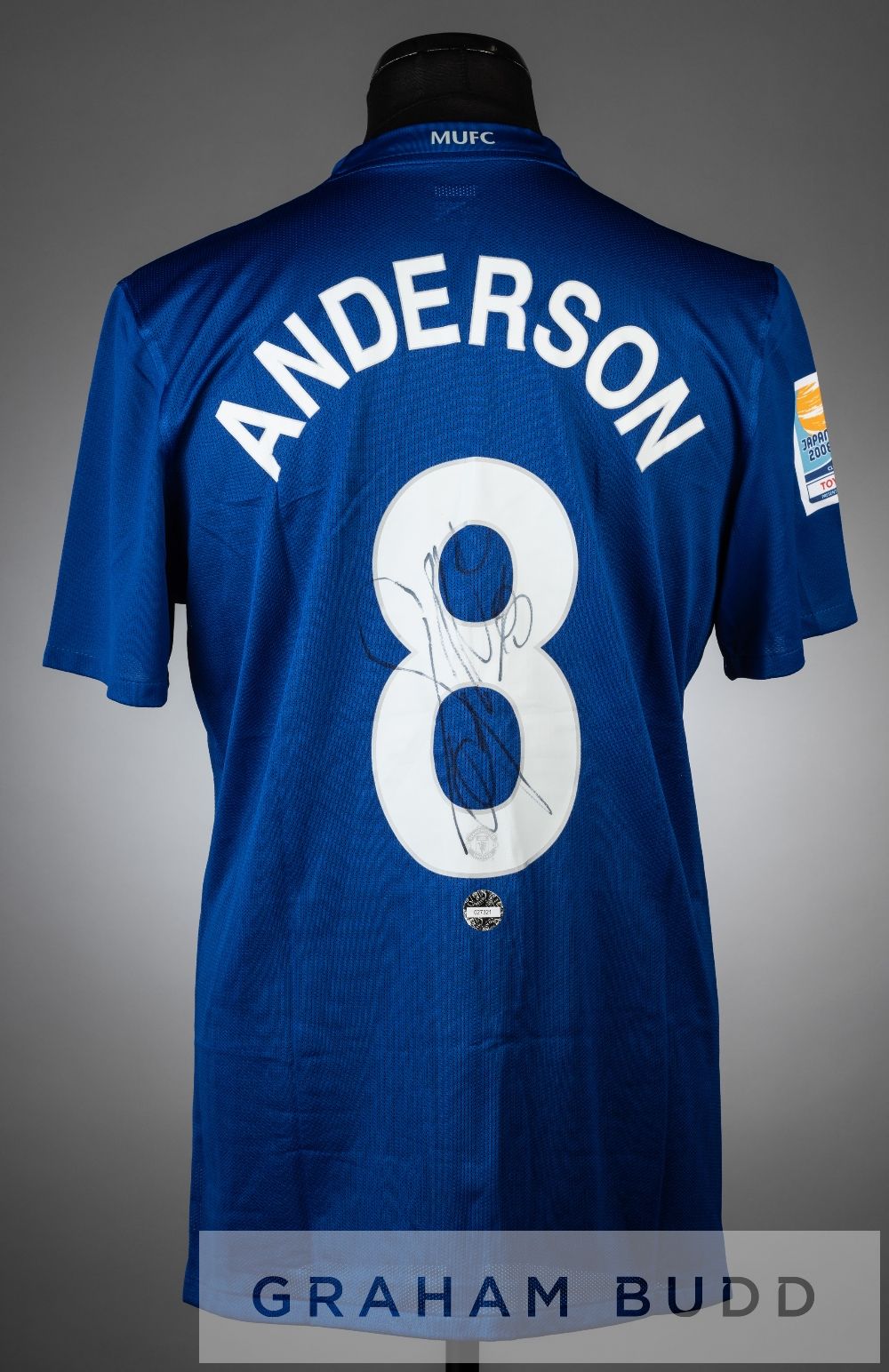 Anderson signed blue and white Manchester United no.8 jersey v LDU Quito in the FIFA Club World Cup Final at International Stadium Yokohama, 21st December 2008, short-sleeved with FIFA CLUB WORLD CUP JAPAN 2008 sleeve badge, club crest and sponsor logo, reverse lettered ANDERSON, signed in black marker pen on number eight on reverse and bears certification label numbered 027321, with Manchester United numbered COA This jersey was part of the kit issued in case of a kit clash in the final and were auctioned off by the Manchester United Foundation. Manchester United defeated LDU Quito 1-0, with the winning goal by Wayne Rooney and Anderson receiving a yellow card in the 70th minute and was substituted off in the 88th minute replaced by Darren Fletcher.