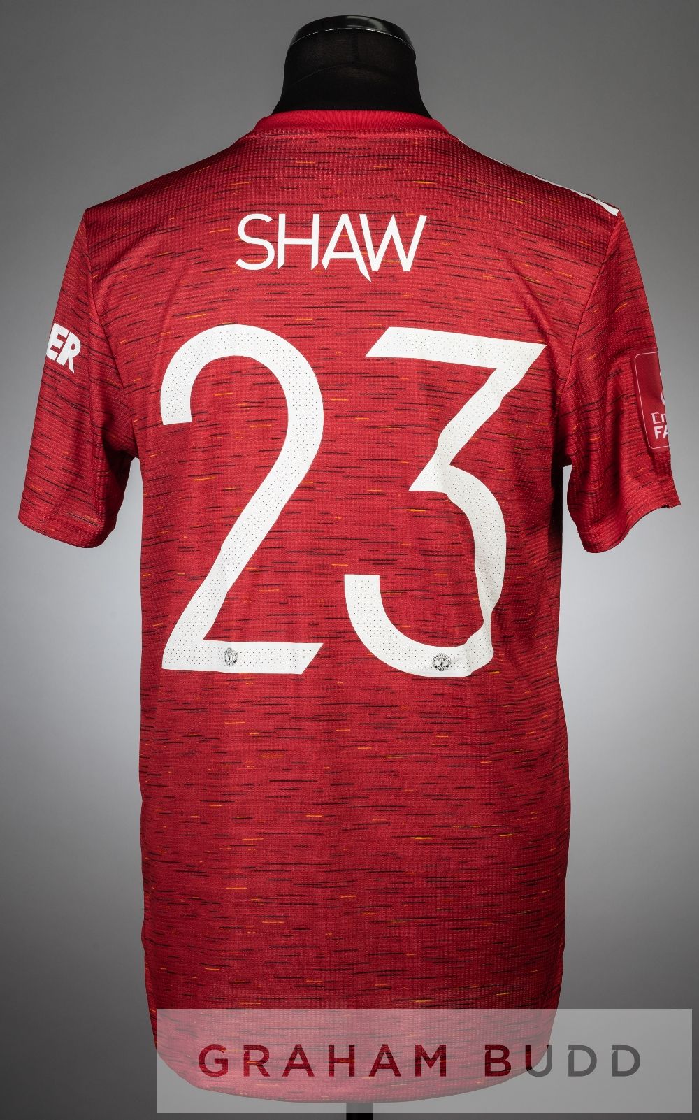 Luke Shaw red Manchester United 23 away jersey v Leicester City in the FA Cup Quarter-Final at King Power Stadium, 21st March 2021, short-sleeved EMIRATES FA CUP sleeve badge, club crest and sponsor logo, reverse lettered SHAW Leicester City defeated Manchester United 3-1, with Luke Shaw substituted on in the 64th minute replacing Alex Telles.