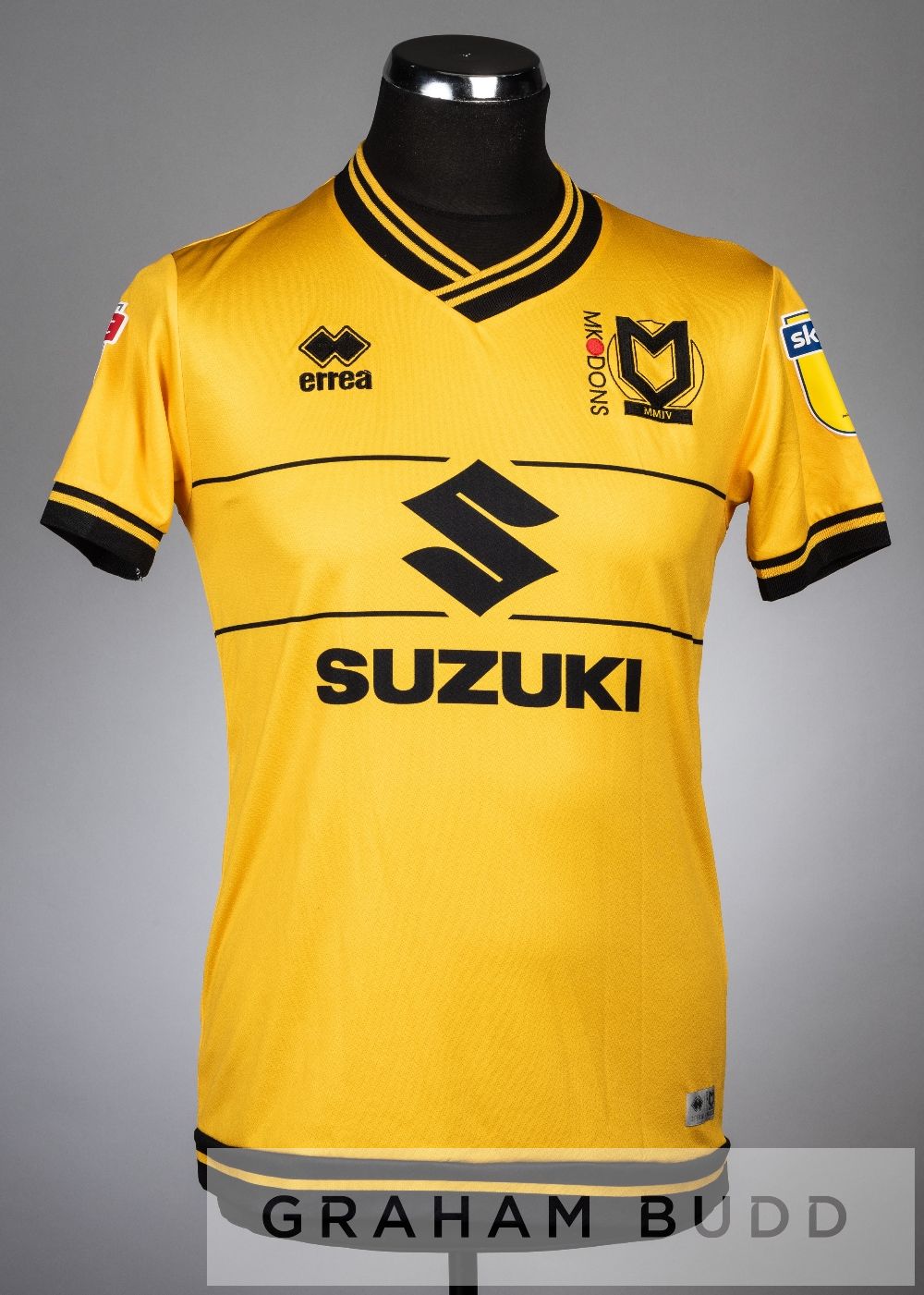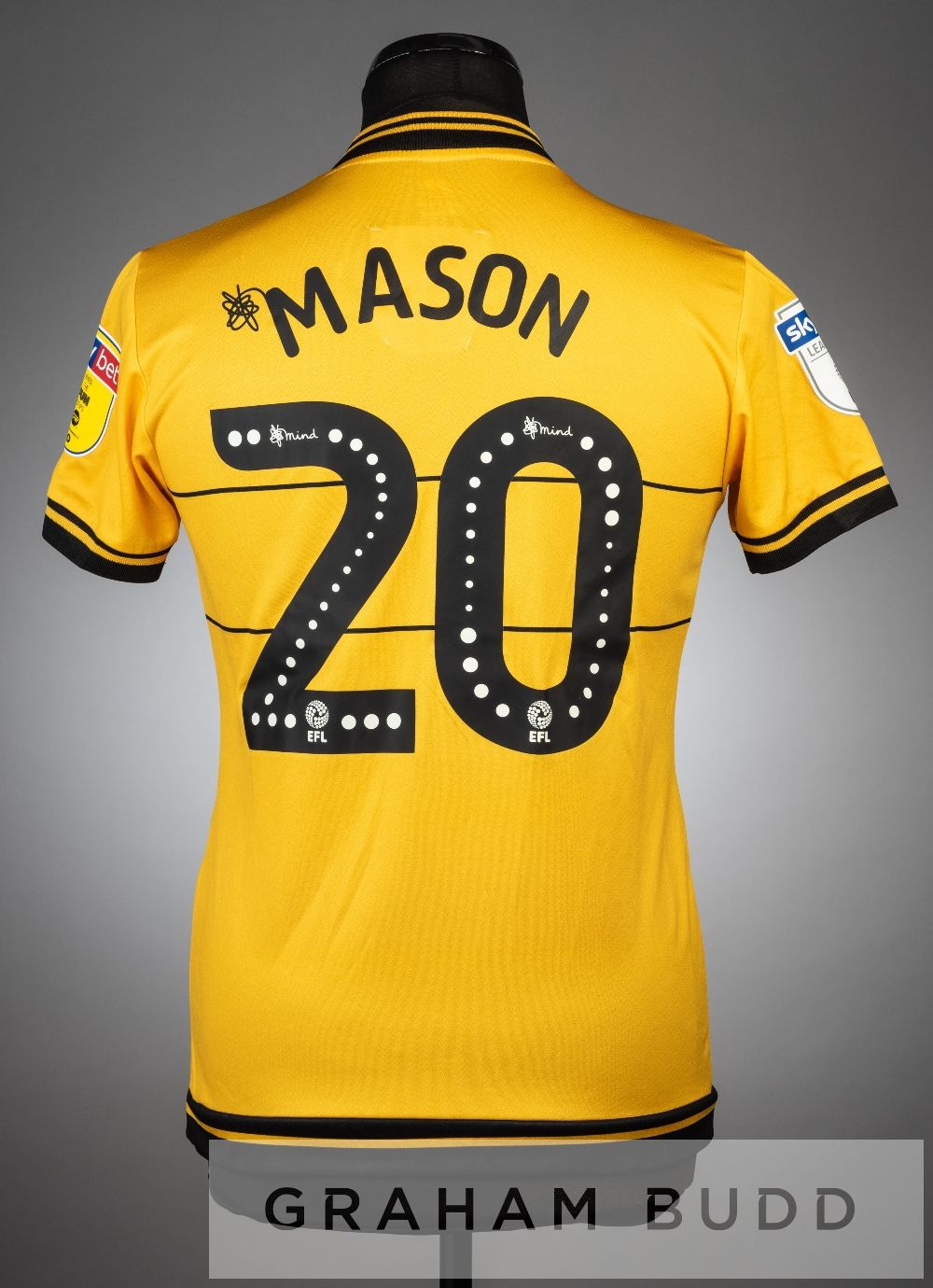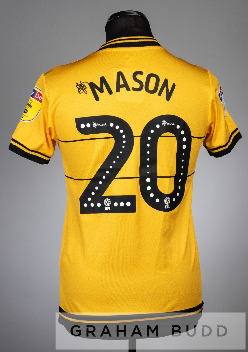 Two Joe Mason yellow and black MK Dons no.20 third choice jerseys, season 2019-20, both short-sleeved with SKY BET LEAGUE ONE EFL and SKY BET WHEN THE FUN STOPS STOP sleeve badges, club crest and sponsor logo, reverse lettered MASON, (2) Recatalopgued under item 60 into March 2022 GB46