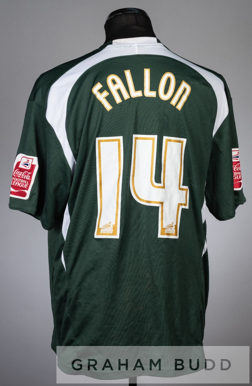 Rory Fallon green and white Plymouth Argyle no.14 away jersey, season 2007-08, short-sleeved with Coca Cola Football League sleeve badges, club crest and sponsor logo, reverse lettered FALLON, bears signs of wear Provenance: Linvoy Primus Portsmouth swap jersey's.