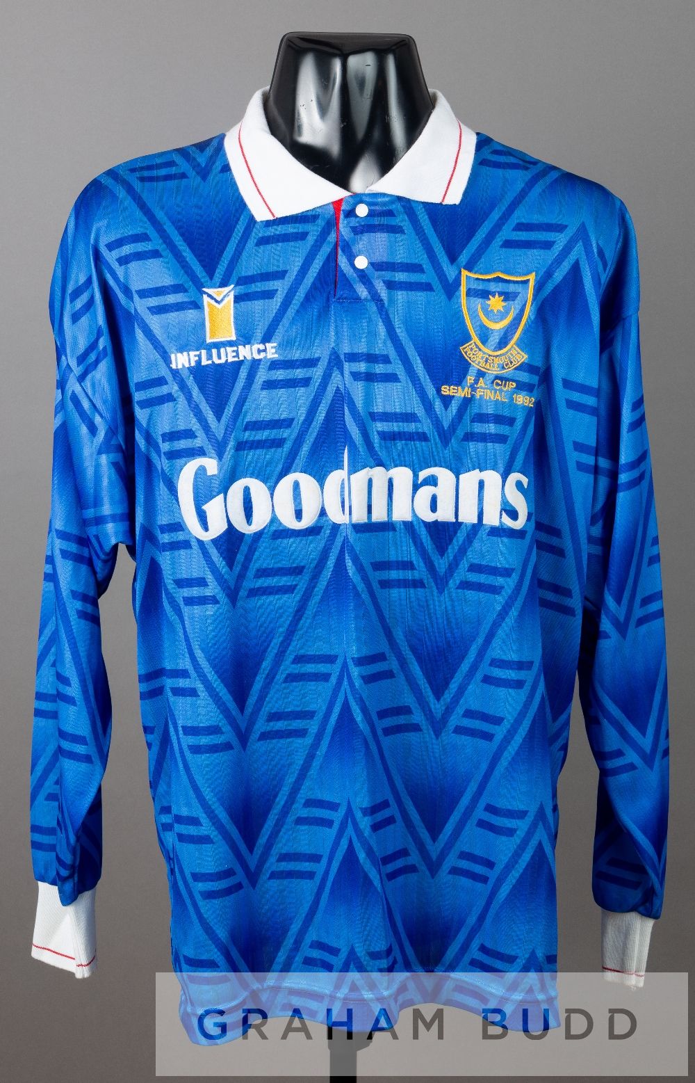 Warren Aspinall blue Portsmouth F.A. Cup Semi-final 1992 no.12 jersey v Liverpool, by Influence, unworn long-sleeved spare jersey with left sleeve embroidered with F.A. CUP SEMI-FINAL 1992, club crest and embroidered F.A. CUP SEMI-FINAL 1992 and sponsor logo, reverse numbered 12 In the first semi-final the fixture resulted 1-1 at Highbury on 5th April and in the replay the fixture resulted in a 0-0 draw at Villa Park on 13th April, with Liverpool progressing to the final v Sunderland and winning 2-0.
