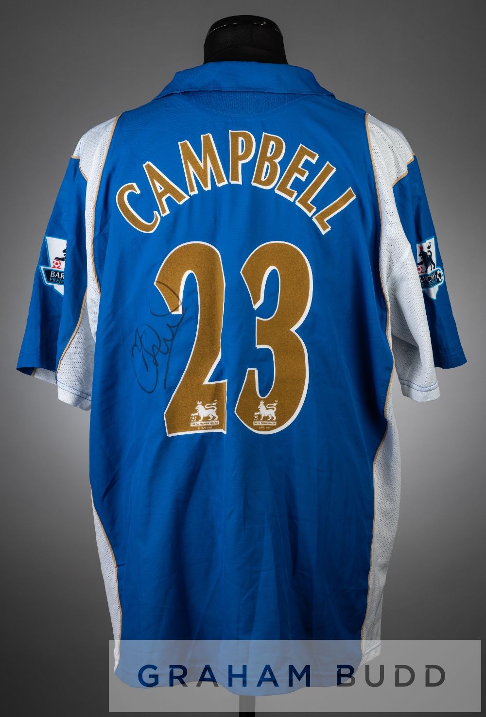 Sol Campbell signed blue and white Portsmouth no.23 home jersey, season 2006-07, short-sleeved with BARCLAYS PREMIERSHIP sleeve badges, club crest and sponsor logo, reverse lettered CAMPBELL, signed in black marker pen to reverse