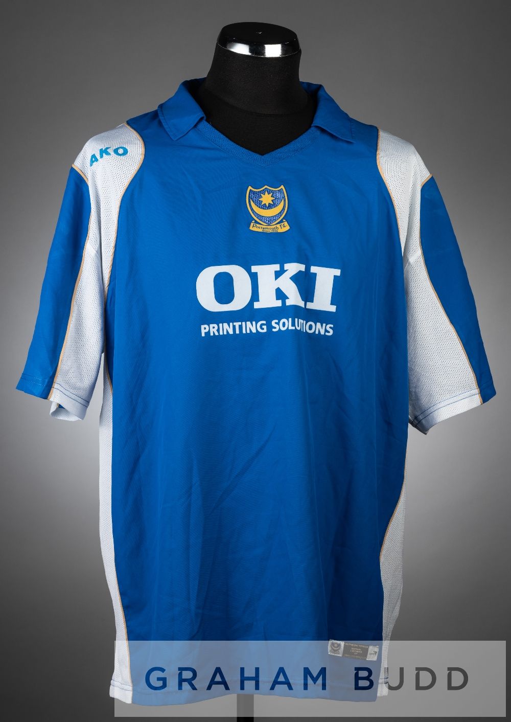 Sol Campbell signed blue and white Portsmouth no.23 home jersey, season 2006-07, short-sleeved with BARCLAYS PREMIERSHIP sleeve badges, club crest an