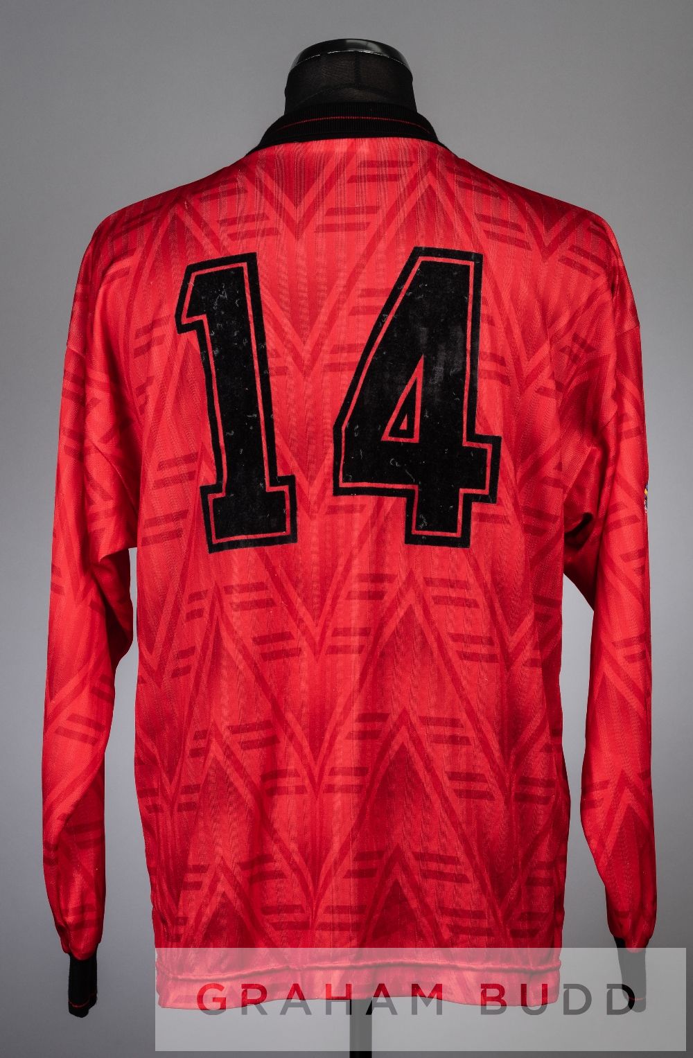 Red and black Portsmouth no.14 substitutes away jersey, season 1992-93, long-sleeved with THE FOOTBALL LEAGUE embroidered sleeve badges, club crest a