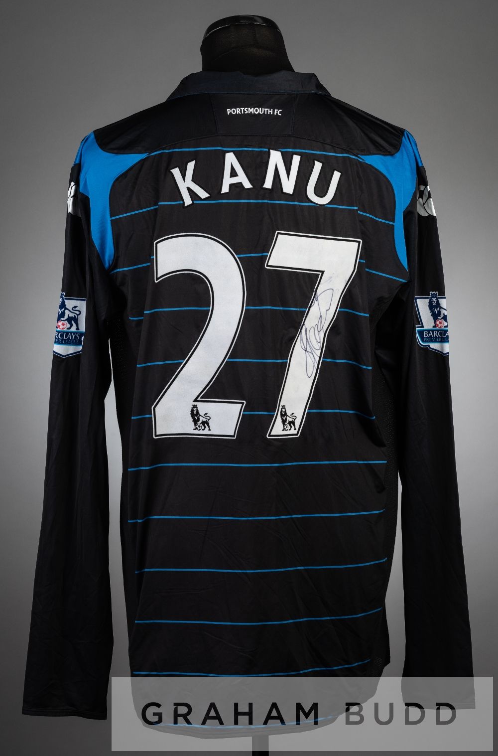 Nwankwo Kanu signed black and blue Portsmouth no.27 third choice jersey, season 2009-10, long-sleeved with BARCLAYS PREMIER LEAGUE sleeve badges, club crest and sponsor logo, reverse lettered KANU, signed in black marker pen in the number seven on reverse