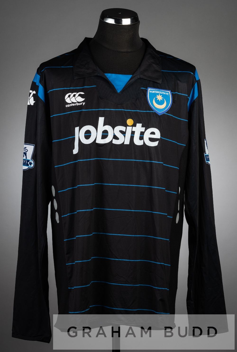 Nwankwo Kanu signed black and blue Portsmouth no.27 third choice jersey, season 2009-10, long-sleeved with BARCLAYS PREMIER LEAGUE sleeve badges, clu
