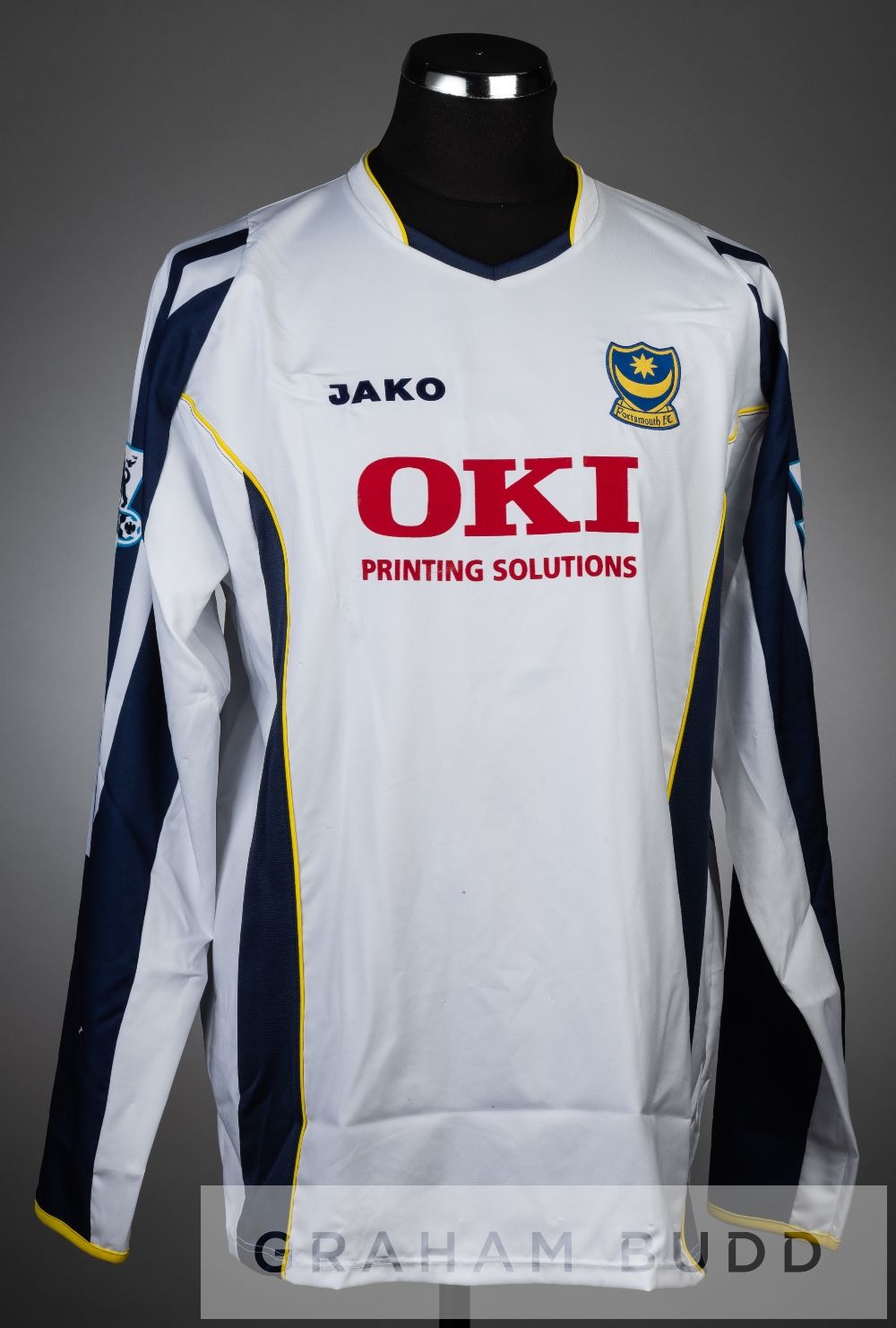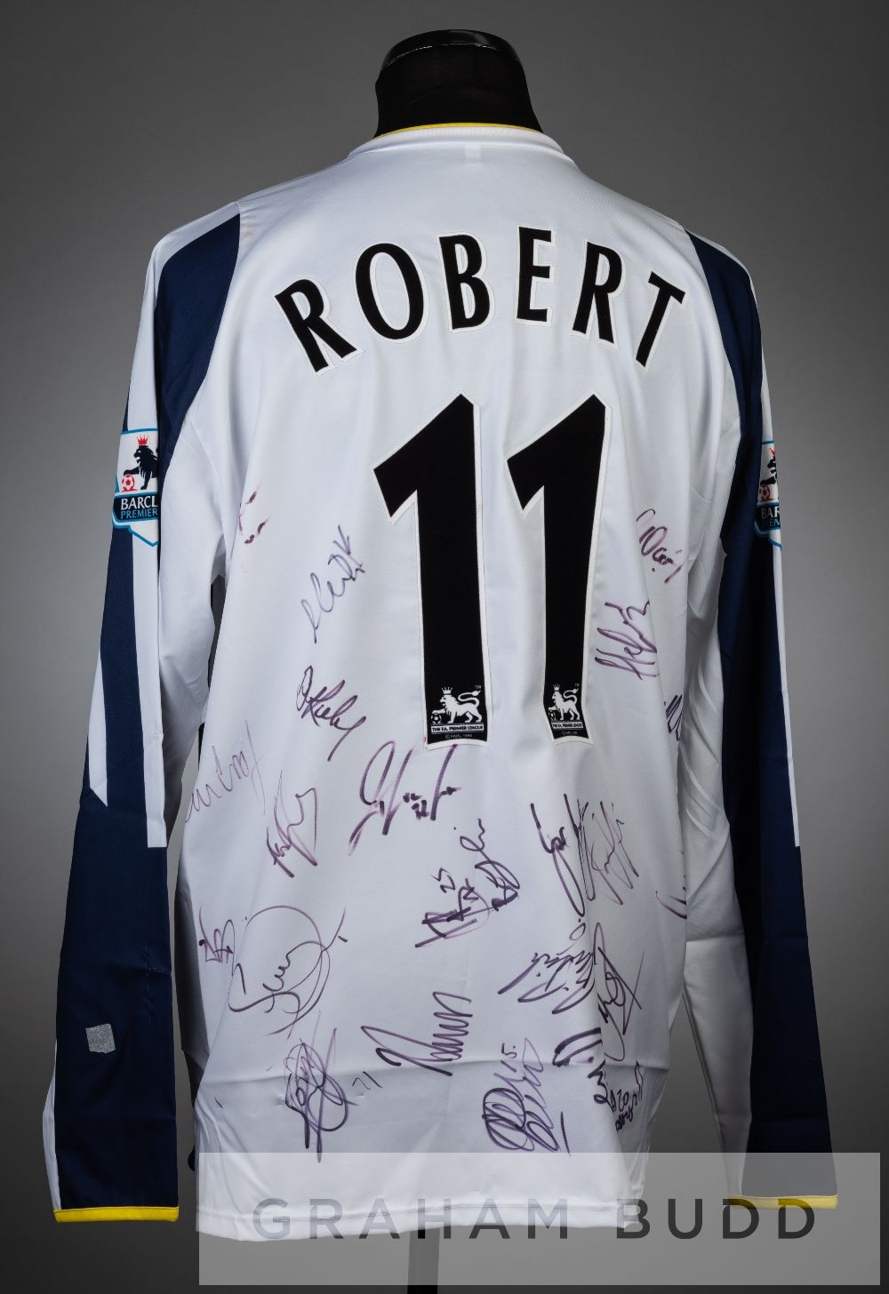 Laurent Robert squad signed white and navy Portsmouth no.11 third choice jersey, season 2005-06, long-sleeved with BARCLAYS PREMIER LEAGUE sleeve badges, club crest and sponsor logo, reverse lettered ROBERT, signed in black marker pen by approximately 22 squad members including Lua Lua, Stefanovic, Mwaruwari, Ashdown and others, bears glue remnants from being mounted in a frame