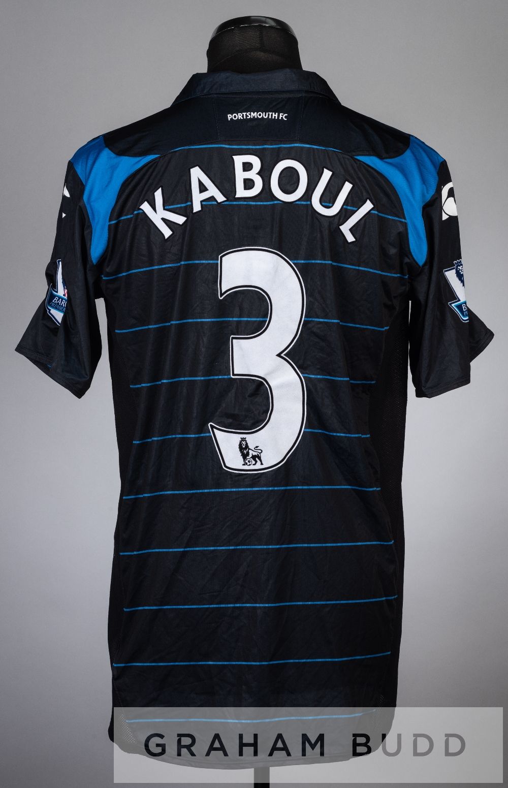 Younes Kabou black and blue Portsmouth no.3 away jersey, season 2009-10, short-sleeved with BARCLAYS PREMIER LEAGUE sleeve badges, club crest and sponsor logo, reverse lettered KABOU Provenance: Linvoy Primus Portsmouth swap jersey's.