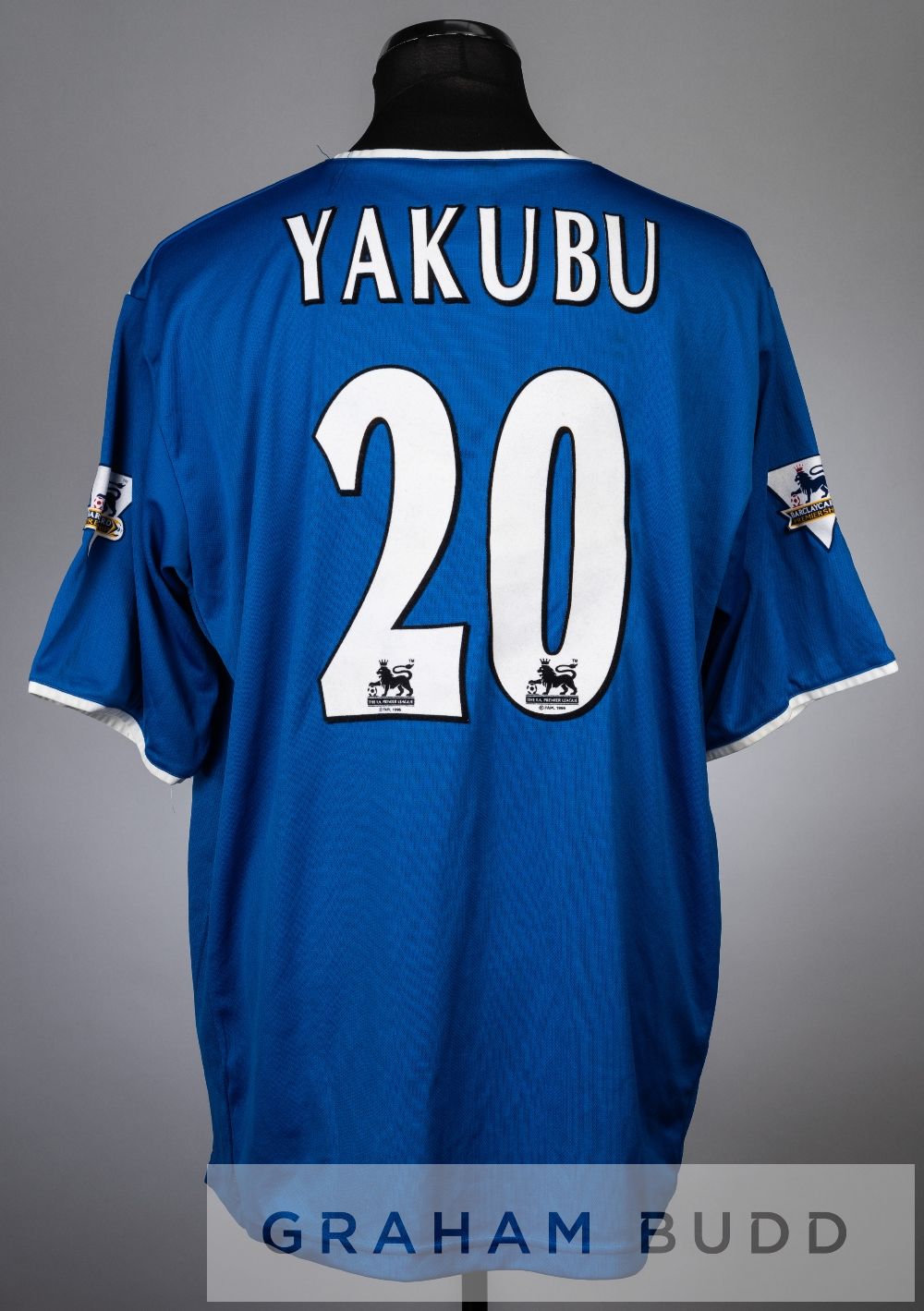 Yakubu signed blue and white Portsmouth no.20 home jersey, season 2003-04, short-sleeved with BARCLAYSCARD PREMIERSHIP sleeve badges, club crest and sponsor logo, reverse lettered YAKUBU, signed in black marker pen to front Provenance: Linvoy Primus Portsmouth swap jersey's.