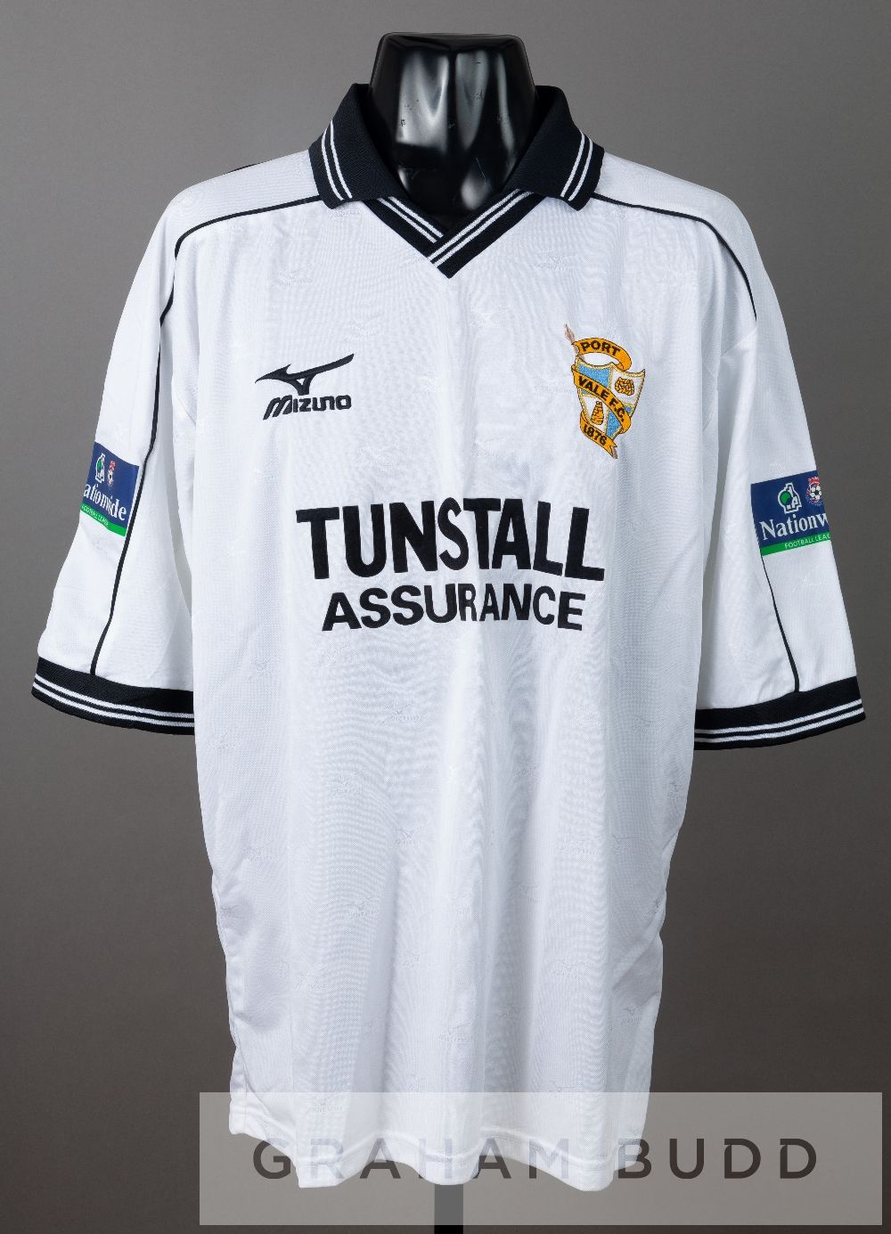 Tony Rougier white and black Port Vale no.17 jersey, season 1999-2000, by Mizuno, short-sleeved with NATIONWIDE FOOTBALL LEAGUE sleeve badges, club c