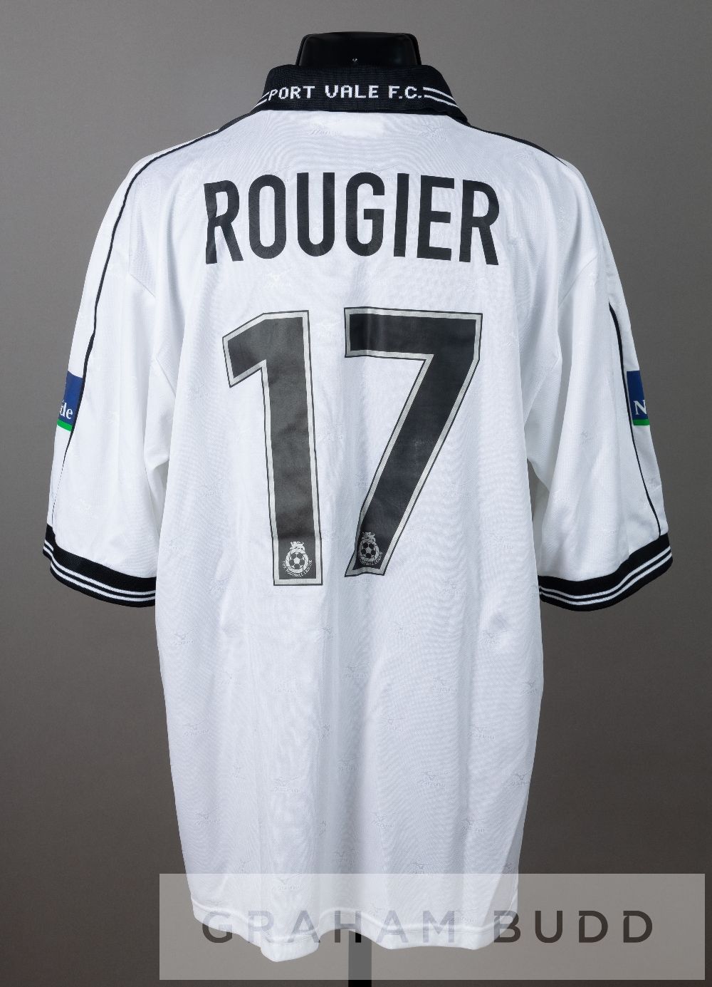 Tony Rougier white and black Port Vale no.17 jersey, season 1999-2000, by Mizuno, short-sleeved with NATIONWIDE FOOTBALL LEAGUE sleeve badges, club crest and sponsor logo, reverse lettered ROUGIER
