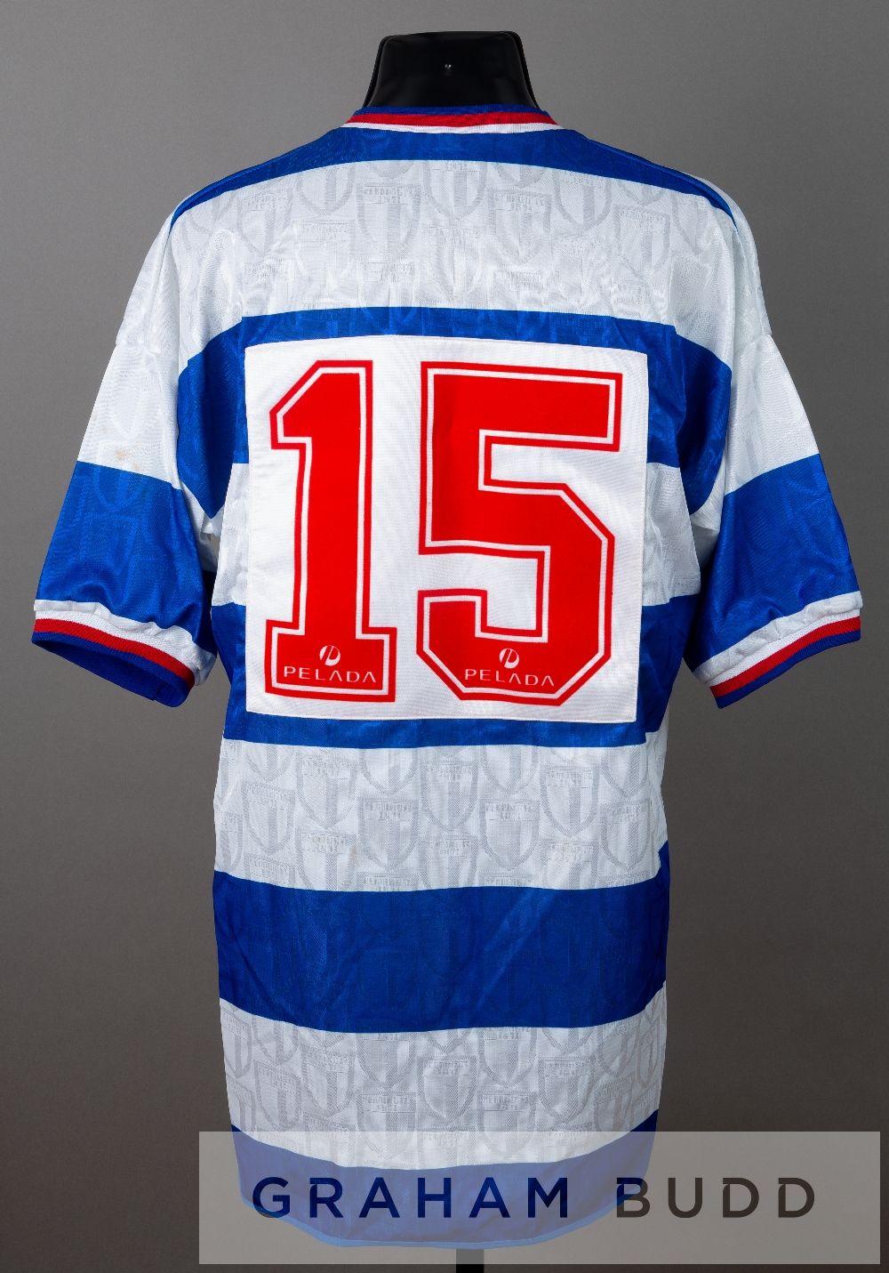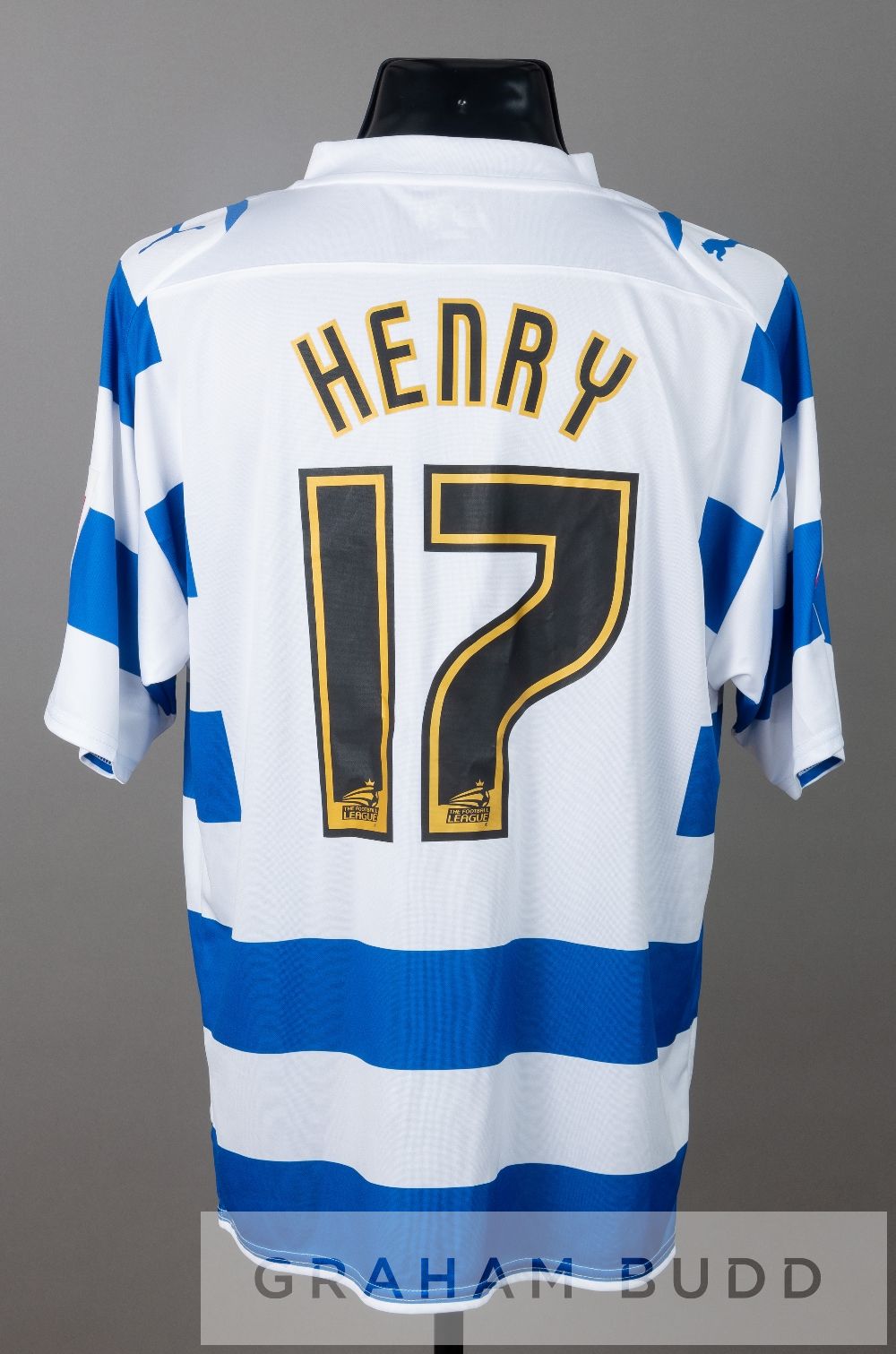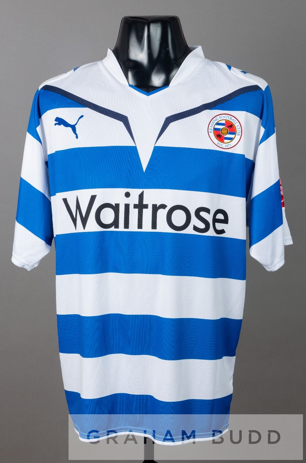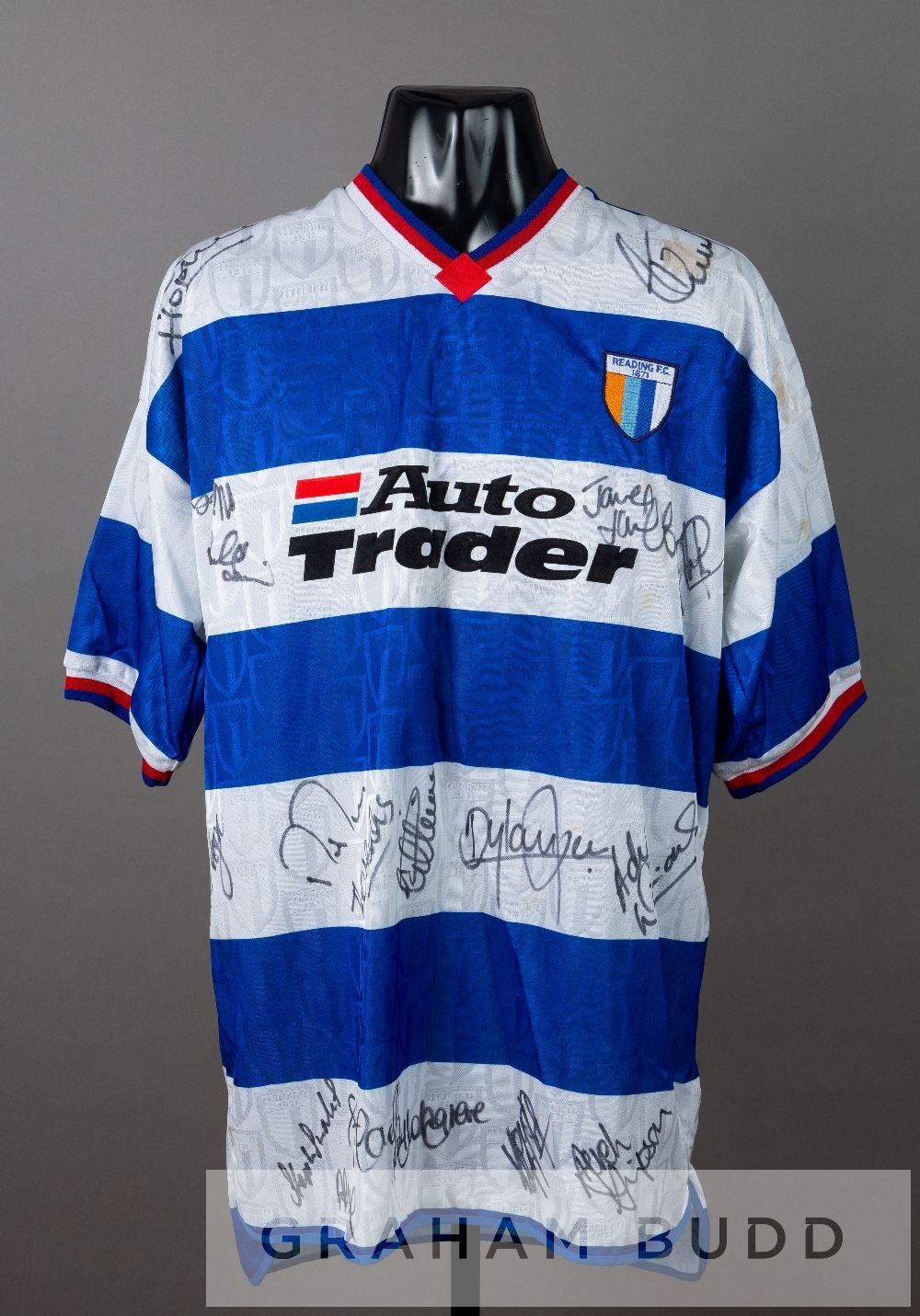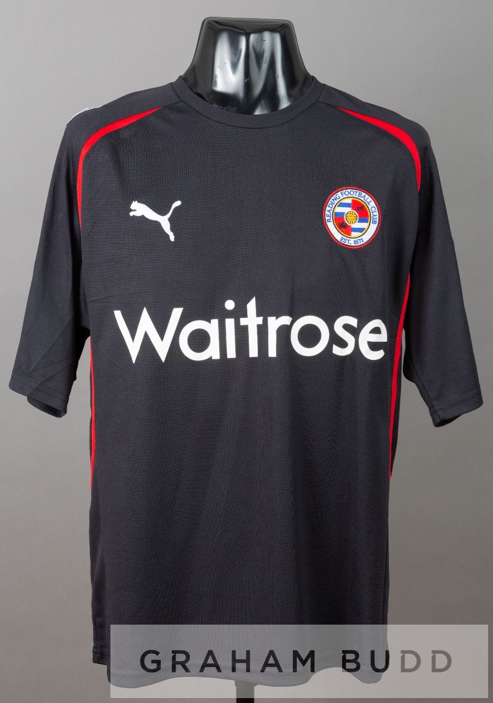 Four Reading home and away jersey's dating from 1990s, comprising a Linvoy Primus red and yellow Reading no.5 away jersey, season 1998-99, by Mizuno, short-sleeved with NATIONWIDE FOOTBALL LEAGUE sleeve badges, club crest and sponsor log, reverse numbered 5, sold with a squad signed blue and white Reading no.15 substitute's jersey, season 1995-96, by Pelada, short-sleeved with club crest and sponsor logo, signed in black marker pen by approximately 18 squad members including James Lambert, Jeff Hopkins, Lee Nogan, Dylan Kerr, Ady Williams, Stuart Lovell, Derek Simpson, Alan Carey and others and a James Henry blue and white striped Reading no.17 home jersey, season 2009-10, by Puma, short-sleeved with COCA-COLA FOOTBALL LEAGUE sleeve badges, club crest and sponsor log, reverse lettered HENRY and a Simon Church black Reading no.18 away jersey, season 2010-11, by Puma, short-sleeved with NPOWER FOOTBALL LEAGUE sleeve badges, club crest and sponsor log, reverse lettered CHURCH, (4)