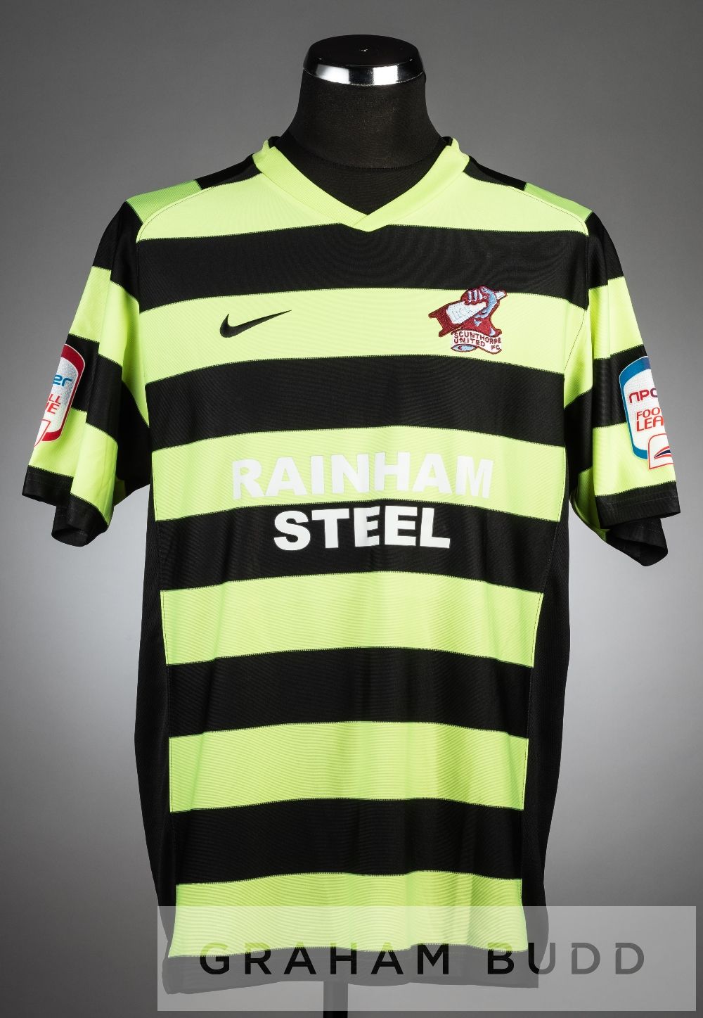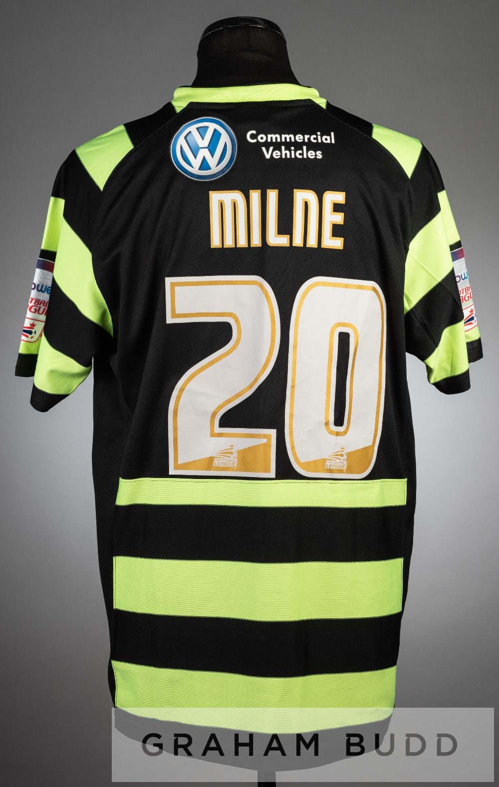 Kenny Milne black and green Scunthorpe United no.20 away jersey, season 2010-11, short-sleeved with NPOWER FOOTBALL LEAGUE sleeve badges, club crest and sponsor logo, reverse lettered MILNE