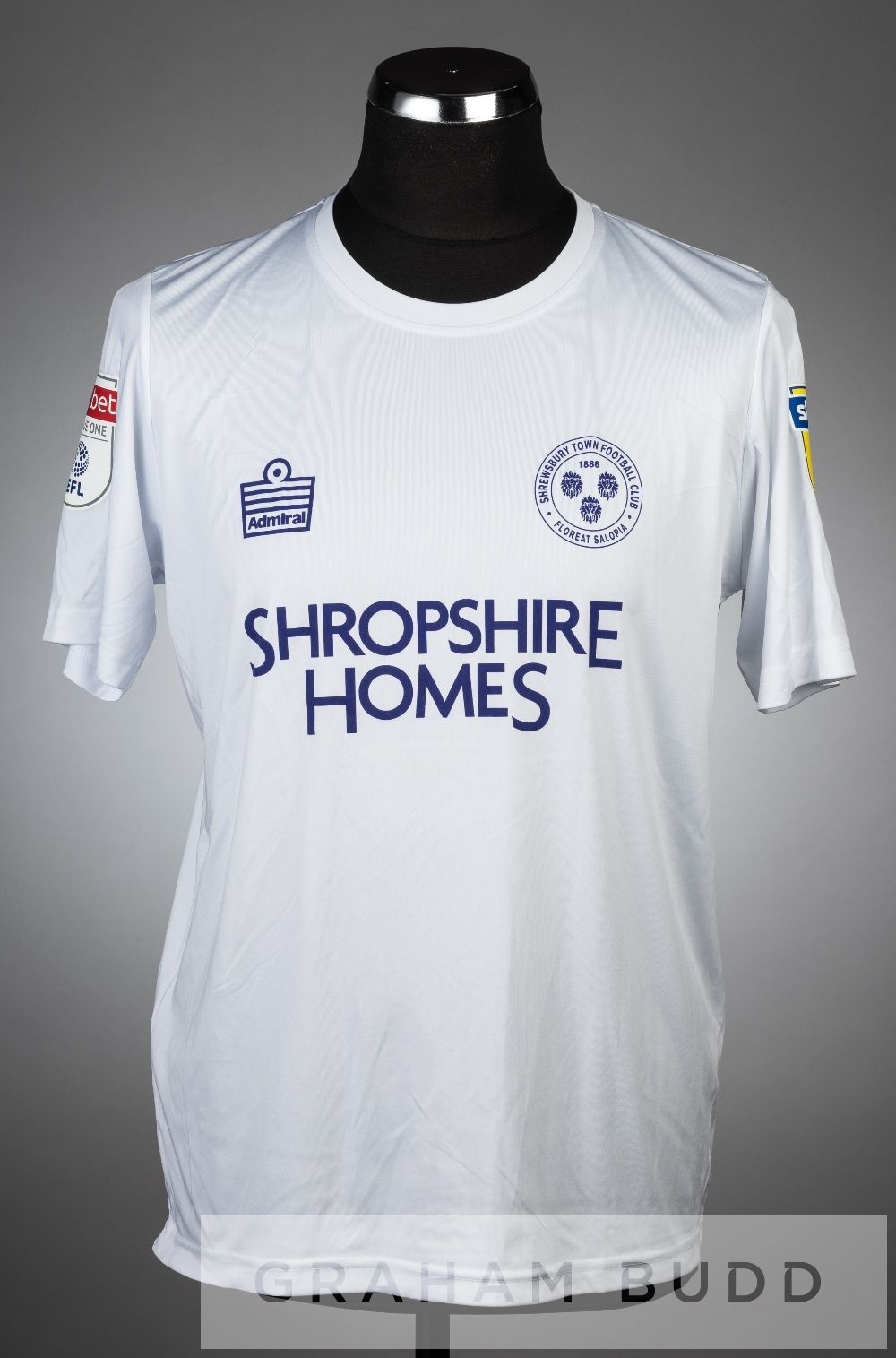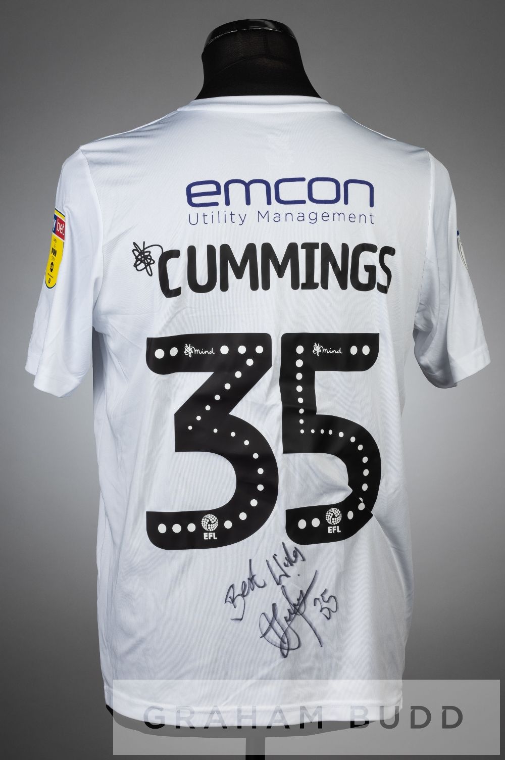 Jason Cummings signed white Shrewsbury Town no.35 third choice jersey, season 2019-20, short-sleeved SKY BET LEAGUE ONE EFL and SKY BET WHEN THE FUN STOPS FUN, club crest and sponsor logo, reverse lettered CUMMINGS, signed in black marker pen on reverse