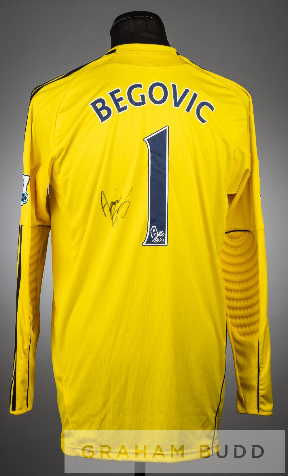 Asmir Begovic signed yellow Stoke City no.1 goalkeeper's change jersey, season 2010-11, long-sleeved with padded elbows, BARCLAYS PREMIER LEAGUE sleeve badges, club crest and sponsor logo, reverse lettered BEGOVIC, signed in black marker pen to reverse