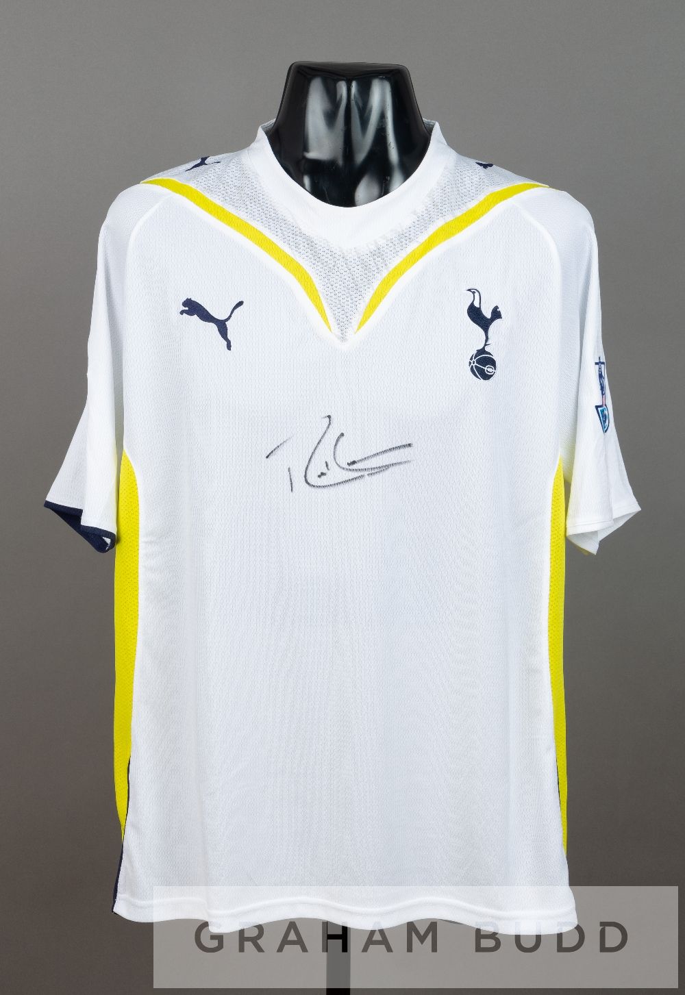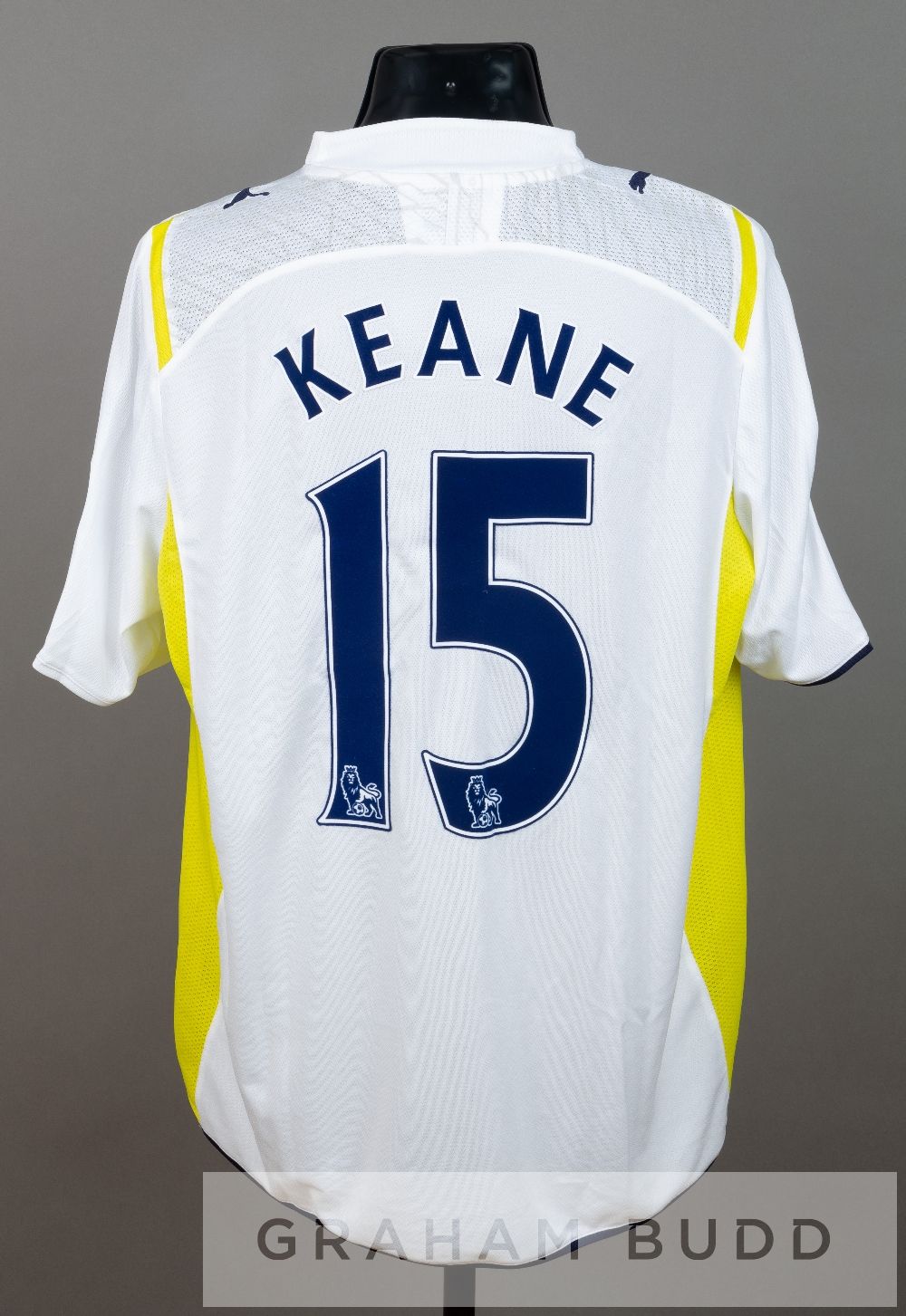 Robbie Keane signed white and yellow Tottenham Hotspur no.15 home jersey from the 2009 Barclays Asia Trophy in Beijing, short-sleeved with BARCLAYS PREMIER LEAGUE sleeve badges, club crest and reverse lettered KEANE, signed in black marker pen to front An ultra rare sponsorless home shirt from this pre-season tournament played in China. Due to online gambling sponsoring being prohibited in China Spurs had to play without a sponsor on their new home shirts for the upcoming season. Keane was still wearing the unusual squad number 15 after he had returned to Tottenham from Liverpool in February 2009 making this shirt very rare. Soon after he would be handed back his regular number 10 again. The shirt was personally signed in black marker pen by Robbie Keane to the front in 2011 at a Republic of Ireland training camp in Malahide, Co. Dublin, Rep. of Ireland.