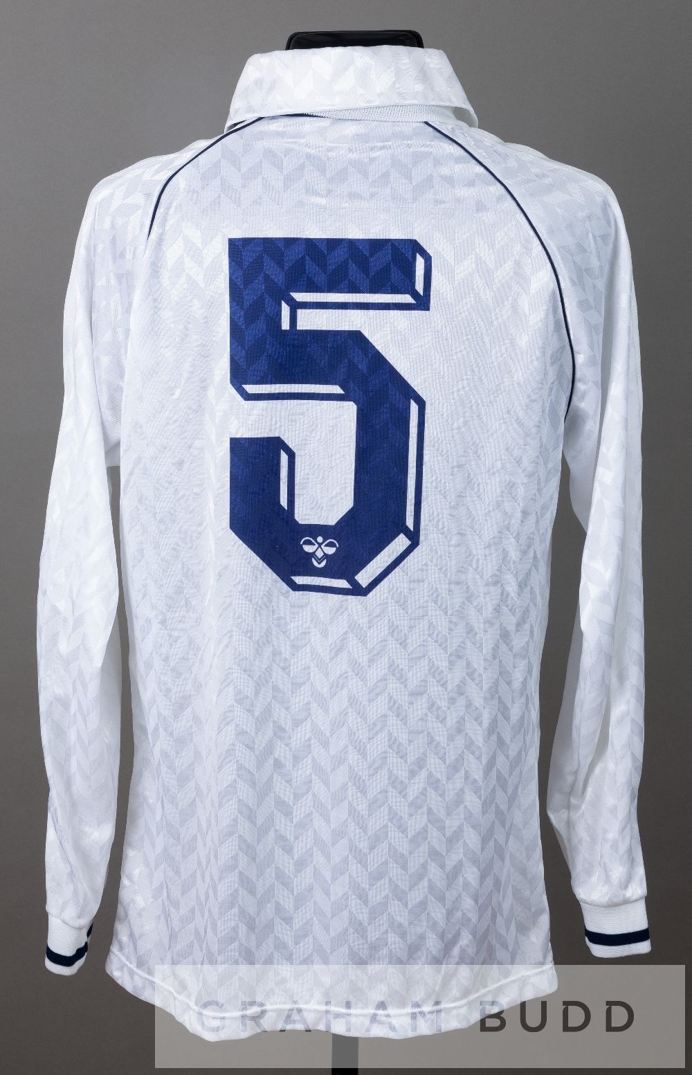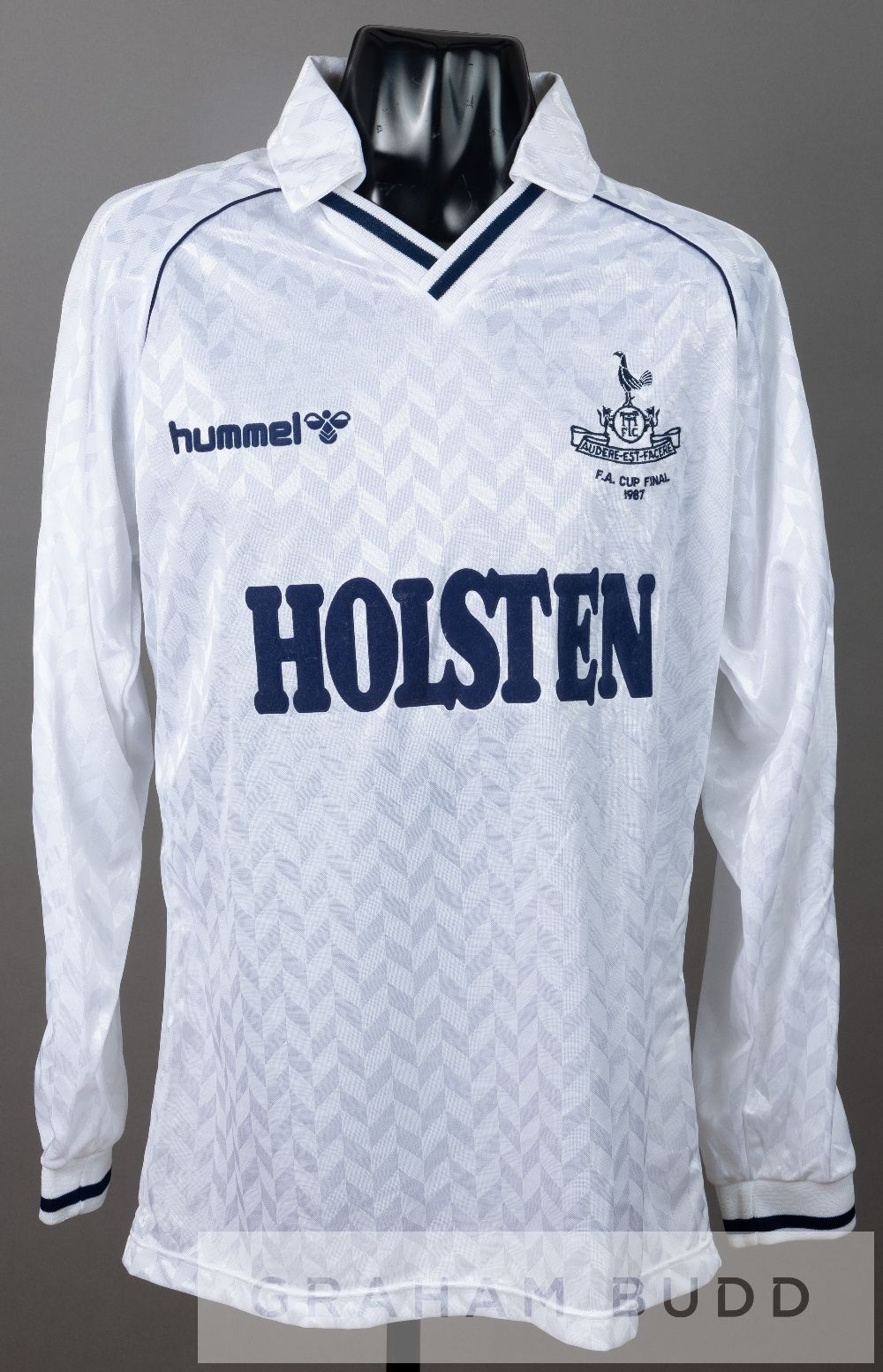 Richard Gough white Tottenham Hotspur 1987 F.A. Cup Final no.5 jersey, by Hummel, long-sleeved unworn spare with embroidered club crest with inscription F.A. CUP FINAL 1987 and sponsor logo, reverse numbered 5 This was the famous final when the kit man produced Tottenham's jerseys with and without sponsor's logo. Tottenham Hotspur were defeated by Coventry 3-2.