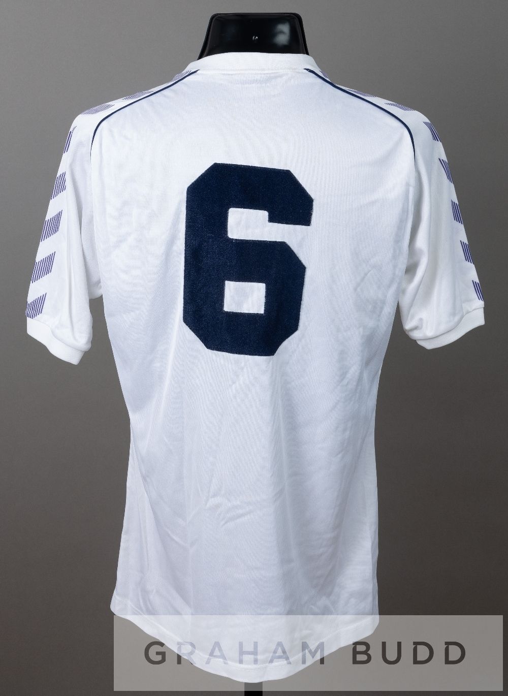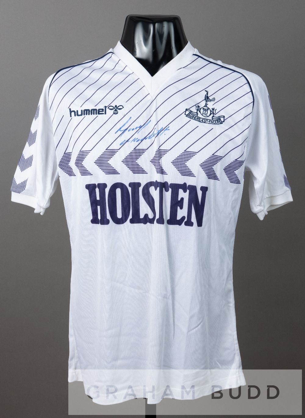 Gary Mabbutt signed white Tottenham Hotspur no.6 home jersey, season 1986-87, by Hummel, short-sleeved with embroidered club crest and sponsor logo, reverse numbered 6, signature to chest in blue marker pen, bears stains to collar