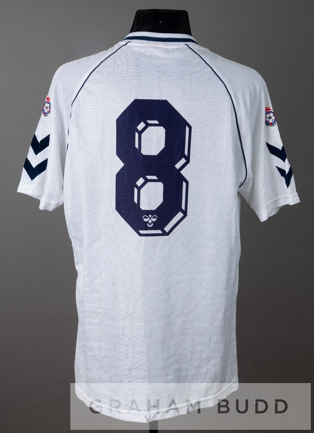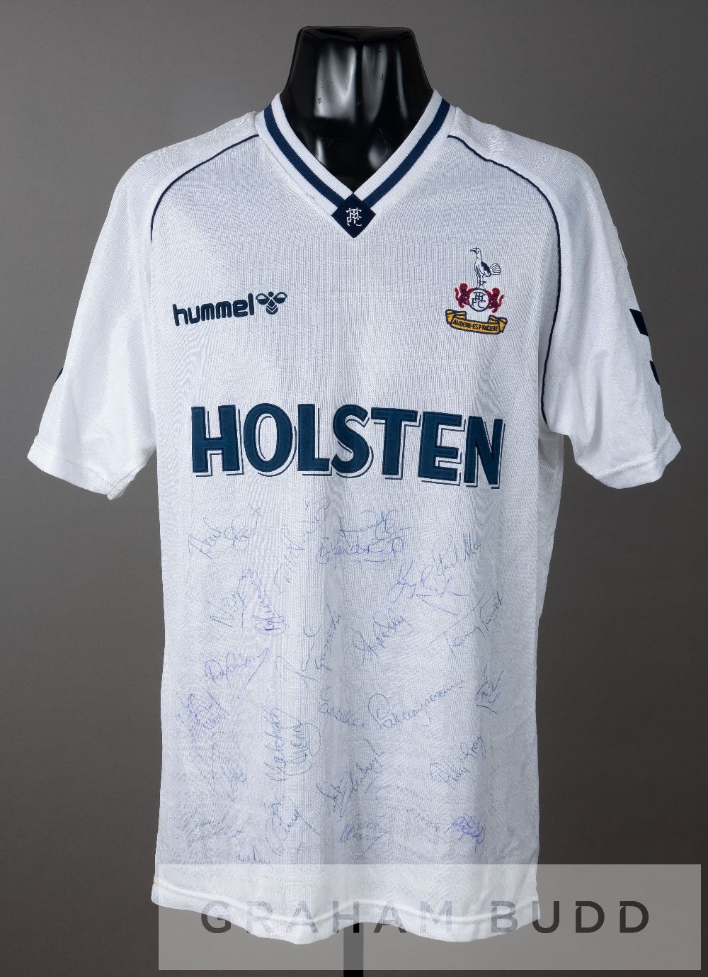 Team signed Paul Gascoigne white Tottenham Hotspur no.8 home jersey, season 1990-91, by Hummel, short-sleeved with THE FOOTBALL LEAGUE sleeve badges, embroidered club crest and sponsor logo, reverse numbered 8, signed in blue pen by approximately 26 squad members including manager Terry Venables, Paul Gascoigne, Pat Van Den Hauwe, Paul Allen, Gary Lineker, Terry Fenwick, Paul Stewart, Steve Sedgley, David Howells, Justin Edinburgh, and others, bears slight stains
