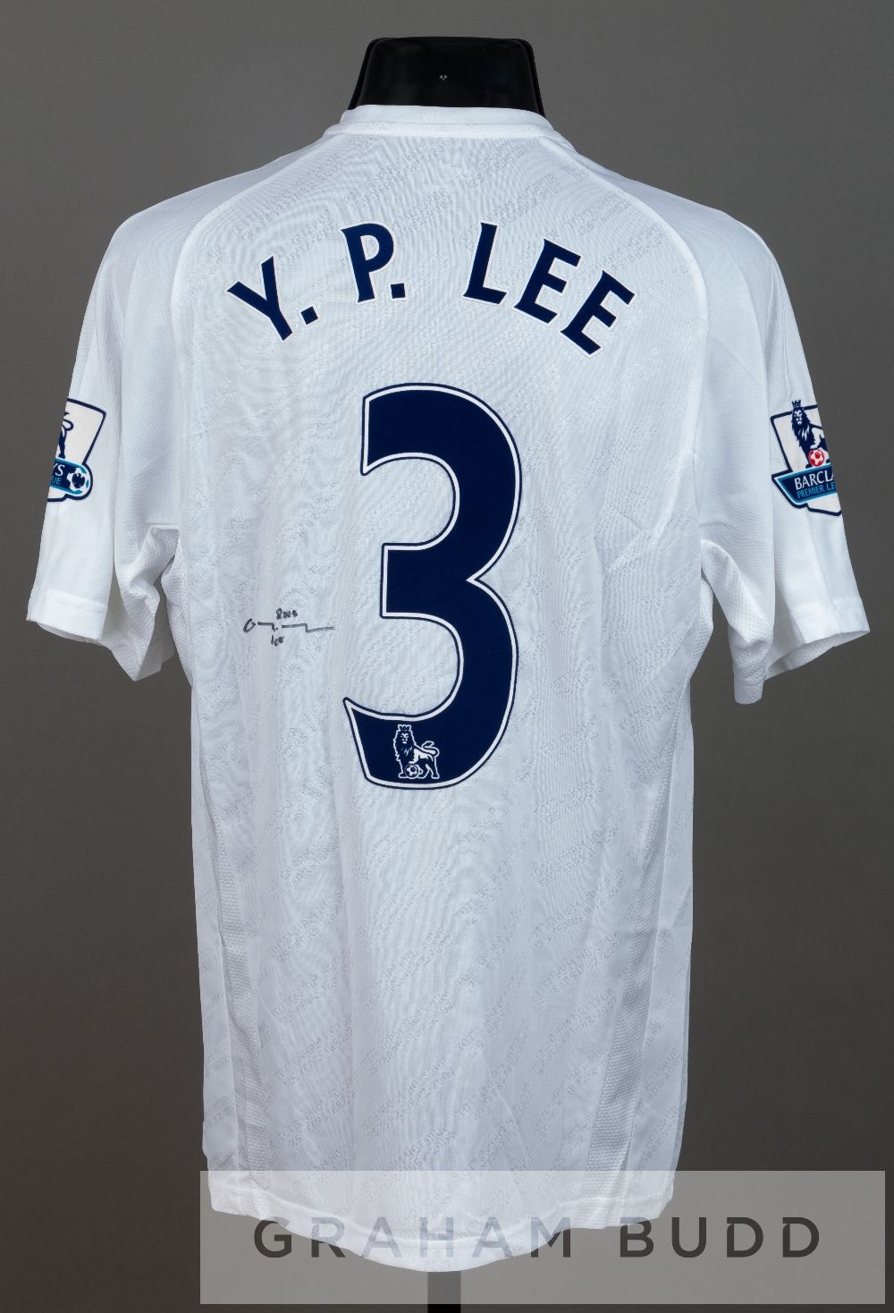 Lee Young-Pyo signed white Tottenham Hotspur no.3 home jersey, season 2007-08, short-sleeved with BARCLAYS PREMIER LEAGUE sleeve badges, club crest w