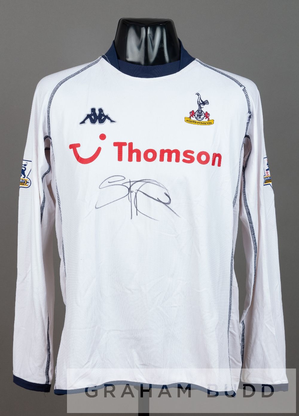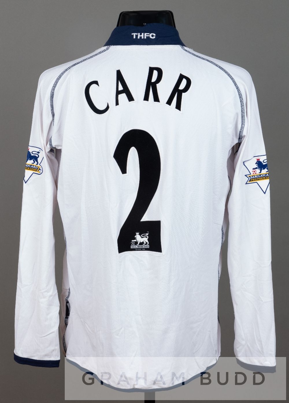 Stephen Carr signed white Tottenham Hotspur no.2 home jersey v Newcastle United at White Hart Lane, 14th March 2004, long-sleeved with BARCLAYCARD PREMIERSHIP sleeve badges, club crest and sponsor logo, reverse lettered CARR, signed in black marker pen to front, bears wear and slight thread pulls, slight pinkish hue from white jersey Tottenham Hotspur defeated Newcastle United 1-0.