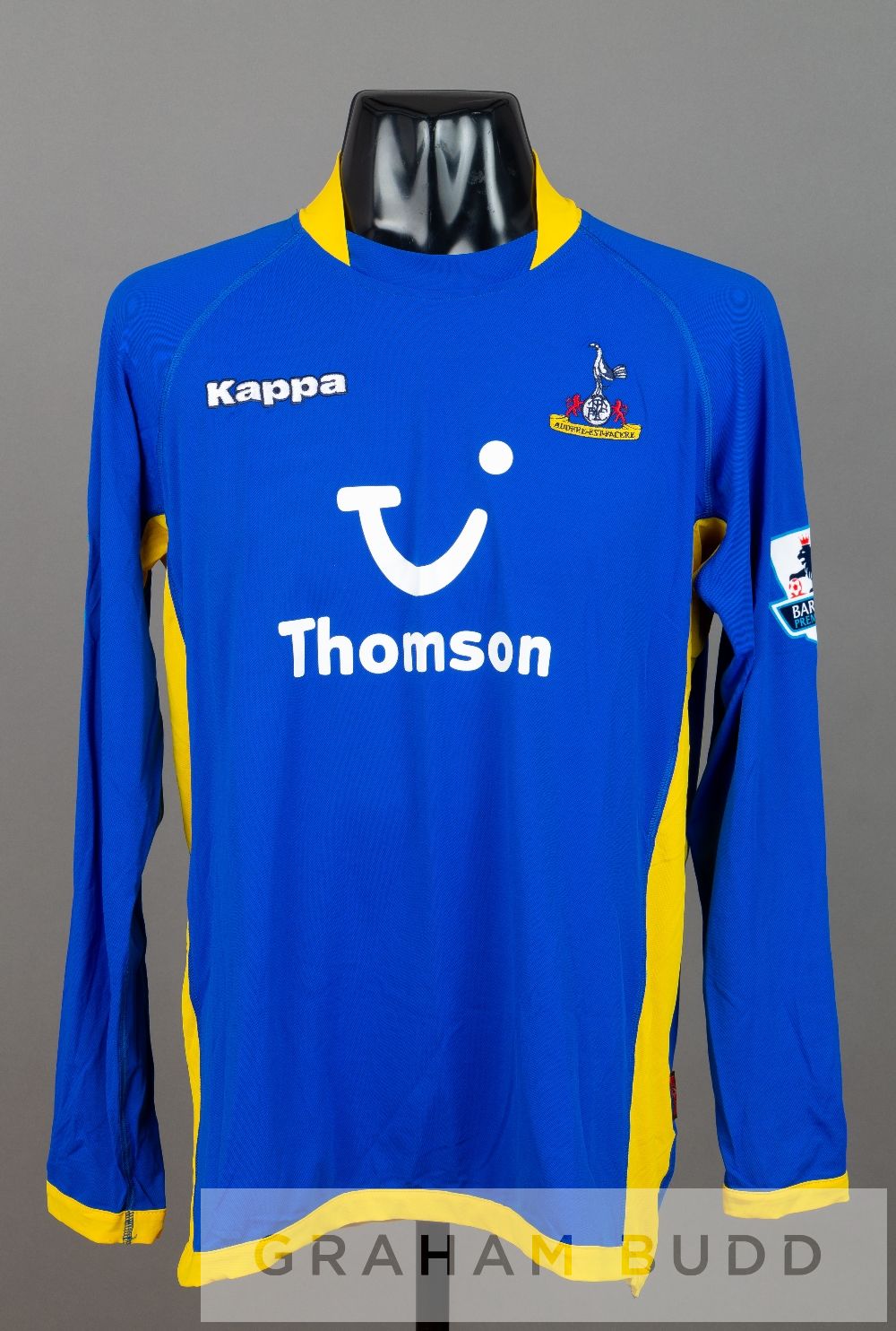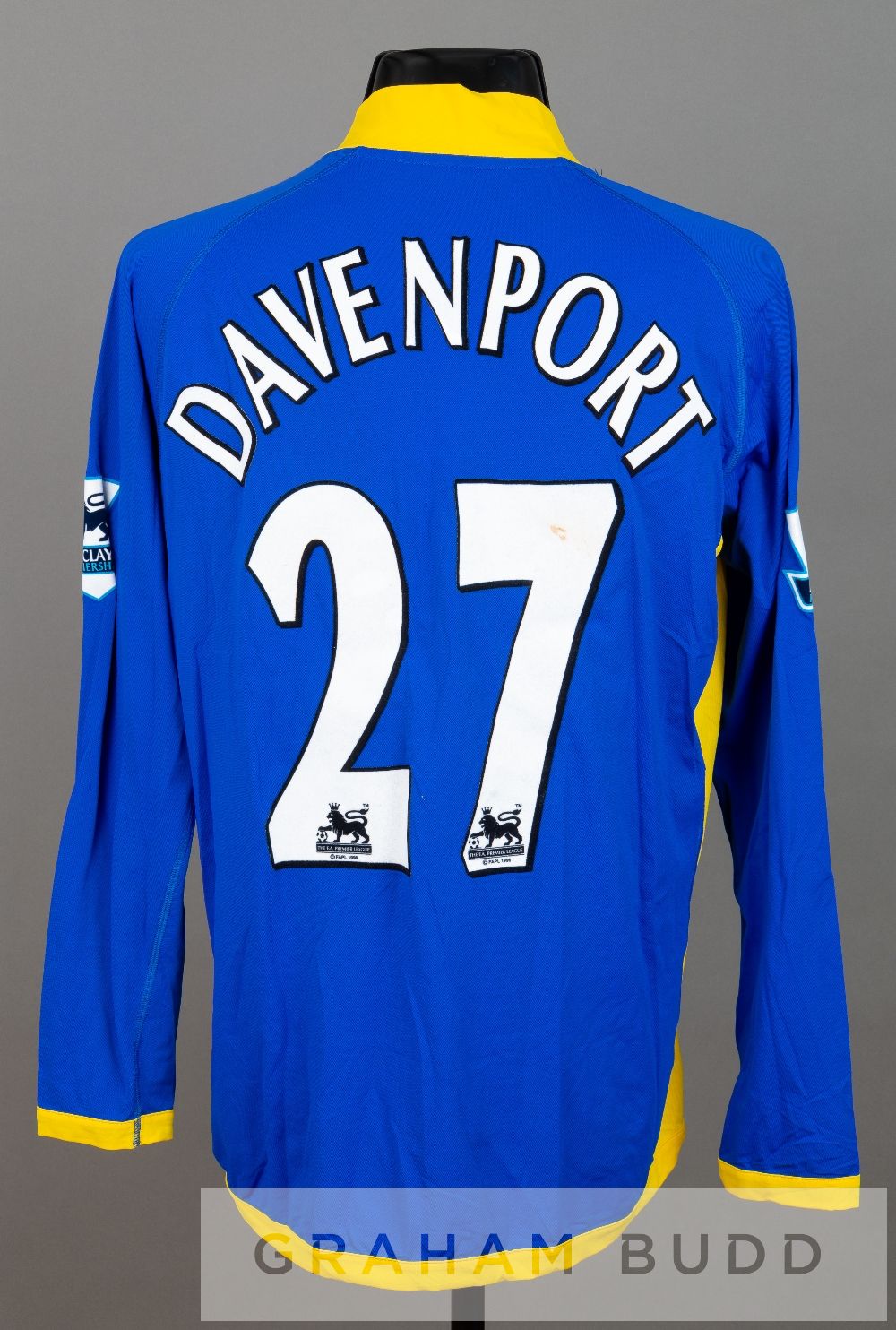 Calum Davenport blue and yellow Tottenham Hotspur no.27 away jersey, season 2005-06, long-sleeved with BARCLAYS PREMIERSHIP sleeve badges, club crest and sponsor logo, reverse lettered DAVENPORT, with minor stains to reverse