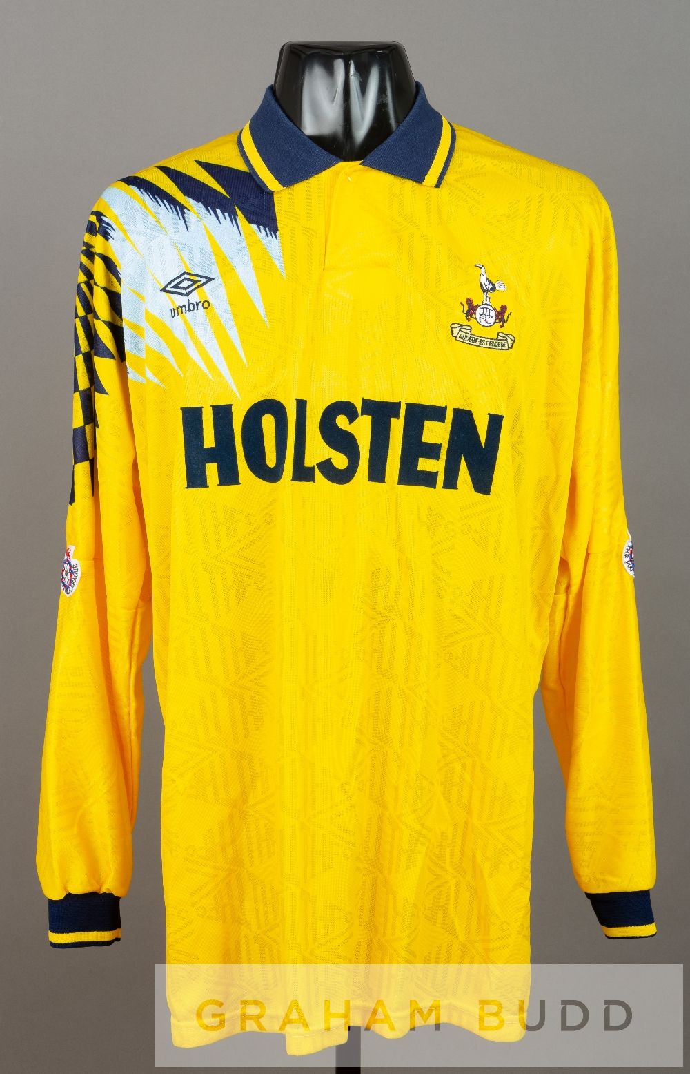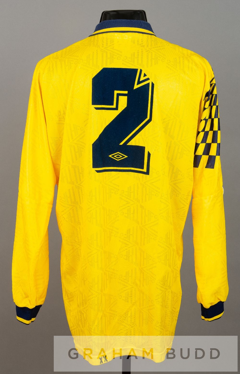 Terry Fenwick yellow and navy Tottenham Hotspur no.2 away jersey, season 1991-92, long-sleeved with THE FOOTBALL LEAGUE sleeve badges, club crest and sponsor logo, reverse numbered 2 This was the last season before the start of the Premier League.