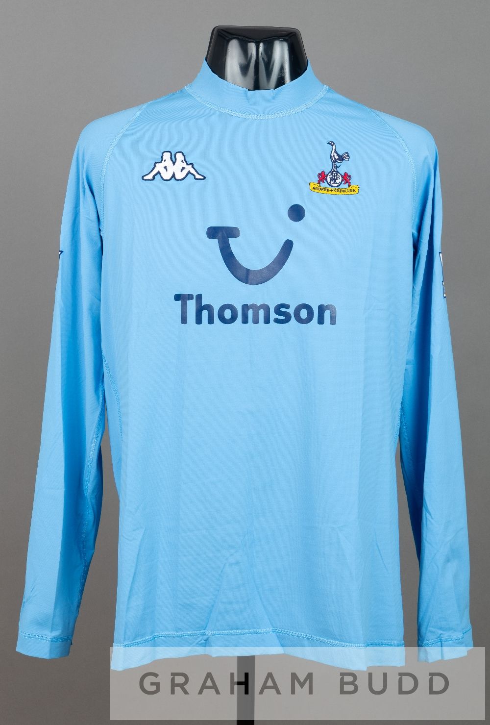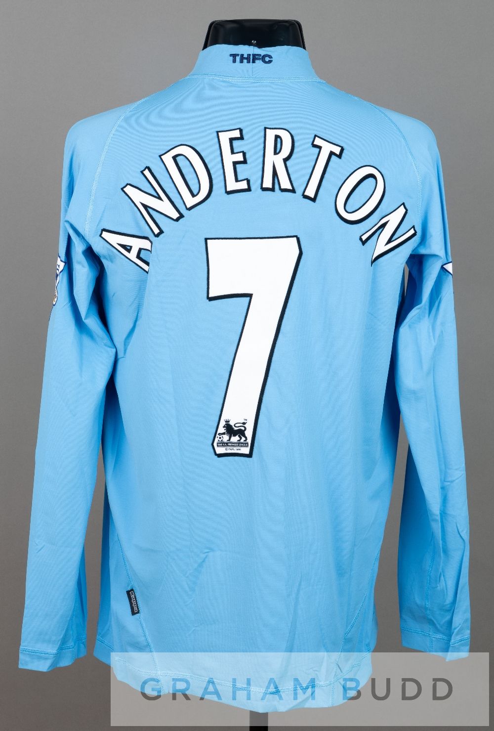 Darren Anderton blue Tottenham Hotspur no.7 away jersey, season 2003-04, long-sleeved with BARCLAYCARD PREMIERSHIP sleeve badges, club crest and sponsor logo, reverse lettered ANDERTON
