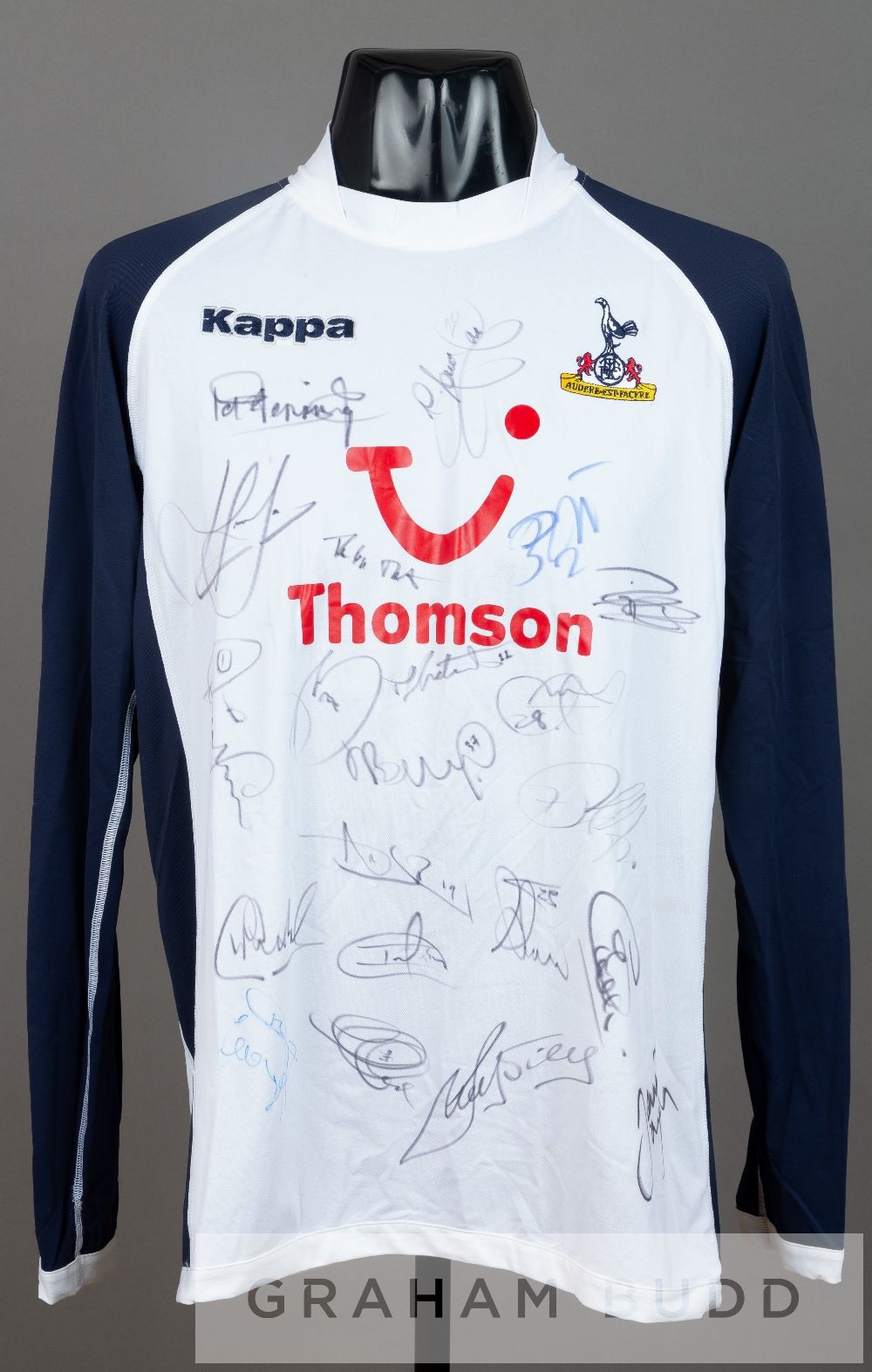 Michael Brown squad signed white and navy Tottenham Hotspur no.11 home jersey, season 2005-06, long-sleeved with BARCLAYS PREMIERSHIP sleeve badges, club crest and sponsor logo, reverse lettered BROWN, signed in black marker pen by approximately 19 squad members including Pat Jennings and Ricky Villa