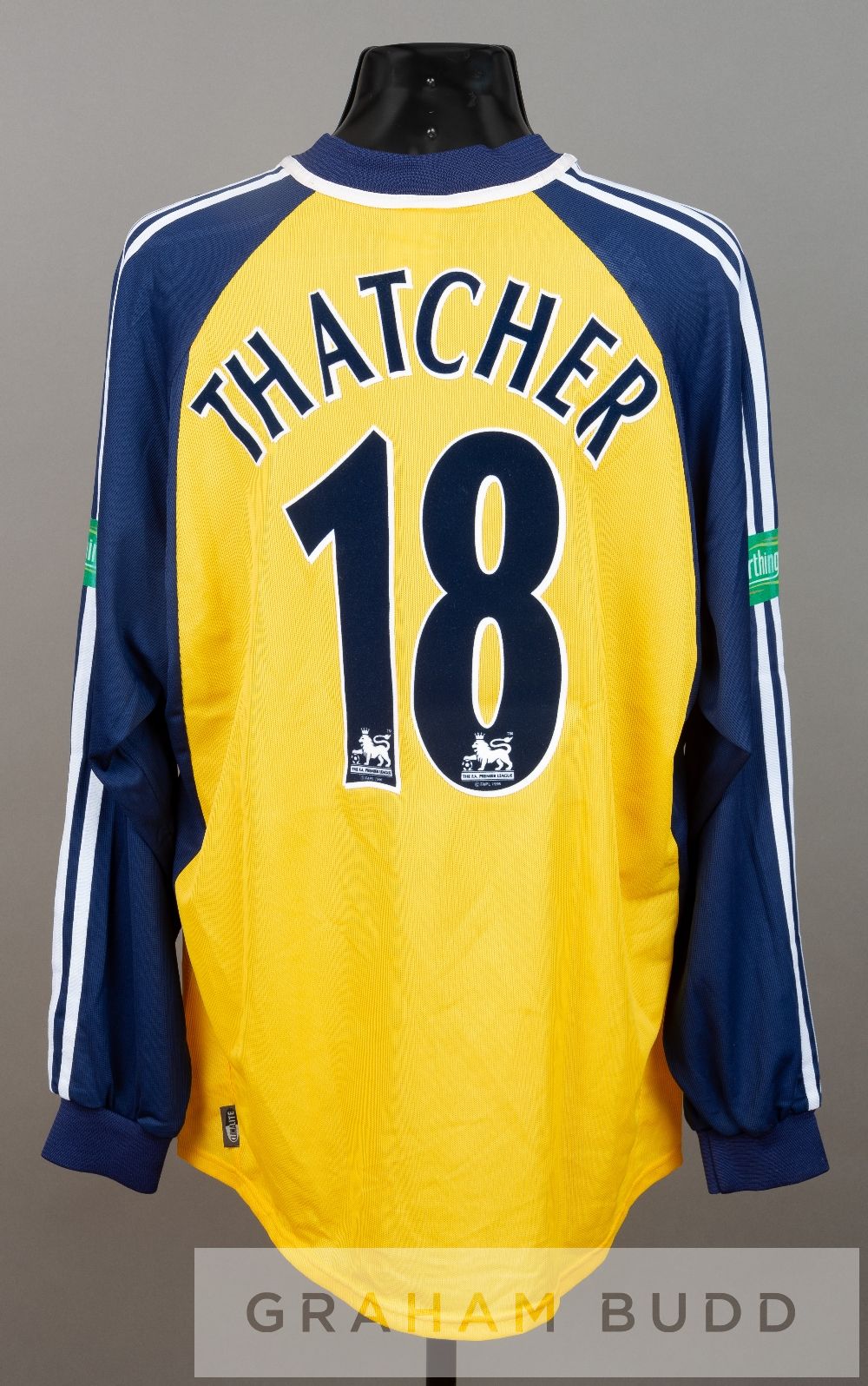 Ben Thatcher yellow and navy Tottenham Hotspur Worthington Cup Final no.18 jersey v Blackburn at Millennium Stadium, 24th February 2002, long-sleeved with WORTHINGTON CUP FINAL sleeve badges, club crest embroidered WORTHINGTON CUP FINAL CARDIFF 2002, sponsor logo, reverse lettered THATCHER Blackburn Rovers defeated Tottenham Hotspur 2-1, with goals by Jansen and Cole for Blackburn Rovers and by Ziege for Tottenham Hotspur, with Ben Thatcher playing on the day.