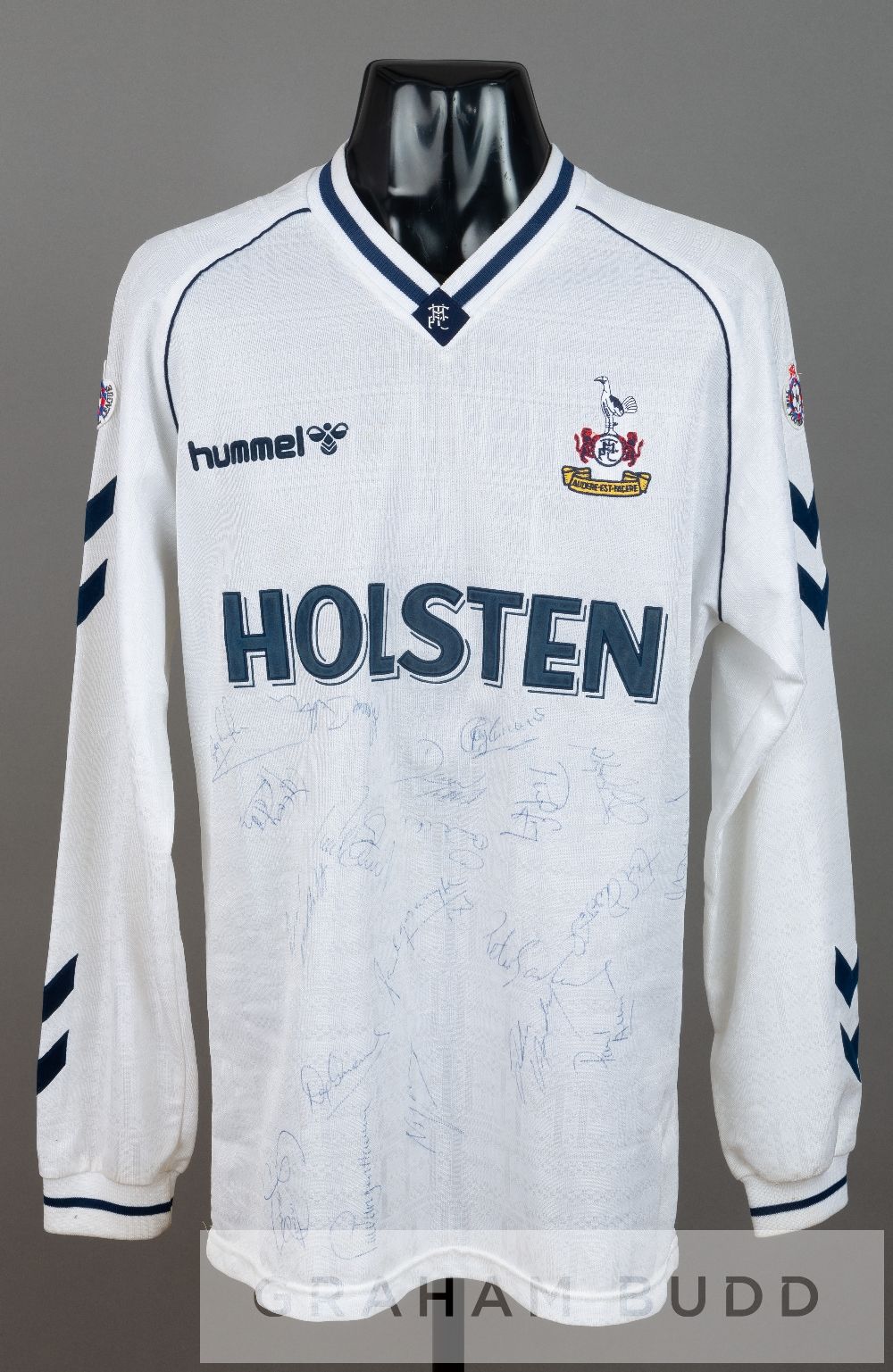 Paul Walsh squad signed white Tottenham Hotspur no.12 home jersey in the FA Cup semi-final v Arsenal, at Wembley 14th April 1991, long-sleeve spare with THE FOOTBALL LEAGUE sleeve badges, club crest and sponsor logo, reverse numbered 12, signed in blue pen by approximately 20 squad members, including Gascoigne, Lineker, Walsh, Allen, Howells and others, with a Matchwornshirts COA, two 12 by 8in. colour photographs of the signed jersey, 8 by 12in, colour photograph of Paul Gascoigne and the team celebrating with legend, a Paul Walsh signed note confirming this jersey was his spare jersey from the 1991 FA Cup semi-final on Tottenham Hotspur letterhead and another from Tottenham Hotspur, (7) Tottenham Hotspur defeated Arsenal 3-1, with goals by Paul Gascoigne and Gary Lineker and with Paul Walsh being substituted on replacing Vinny Samways.
