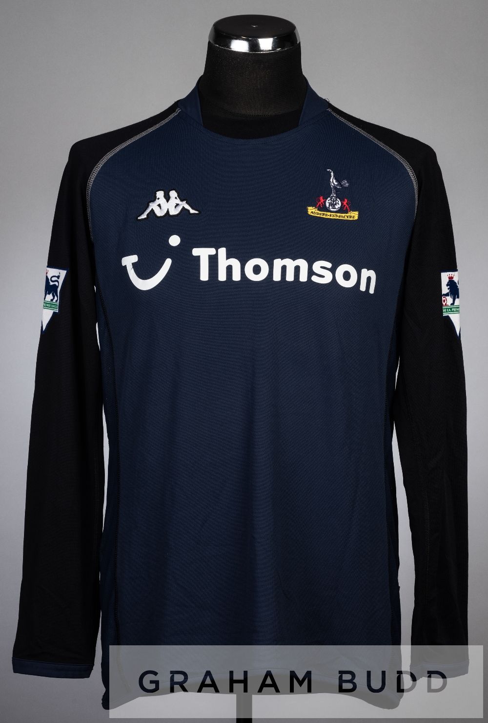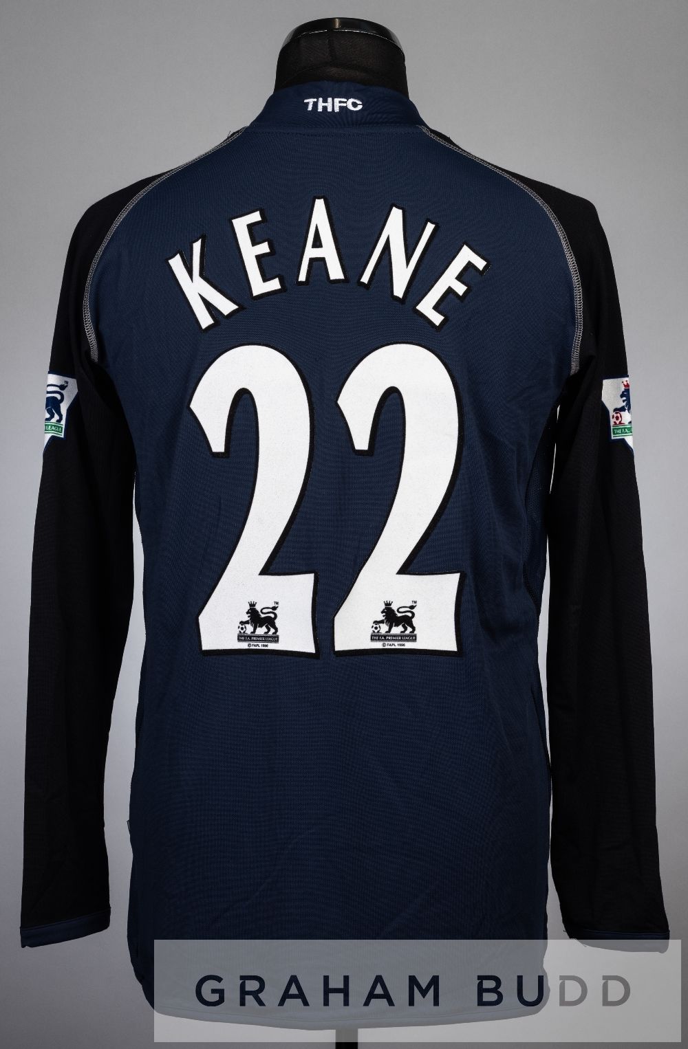 Robbie Keane navy and black Tottenham Hotspur no.22 away jersey, season 2002-03, long-sleeved with THE F.A. PREMIER LEAGUE sleeve badges, club crest and sponsor logo, reverse lettered KEANE, the sponsorship lettering on the front is tacky and care is needed